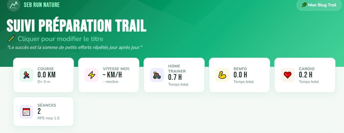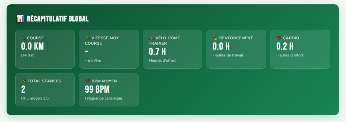 - Récapitulatif global (km cumulés, D+ total, heures de renfo/vélo/cardio, RPE moyen, BPM moyen)