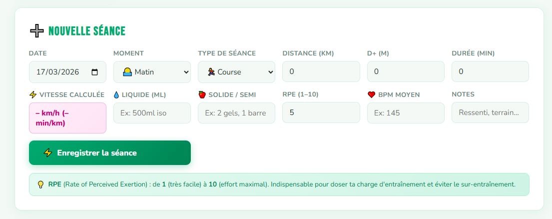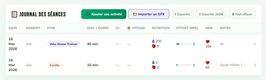 - Journal détaillé (date, type, km, D+, RPE, BPM, nutrition, notes)