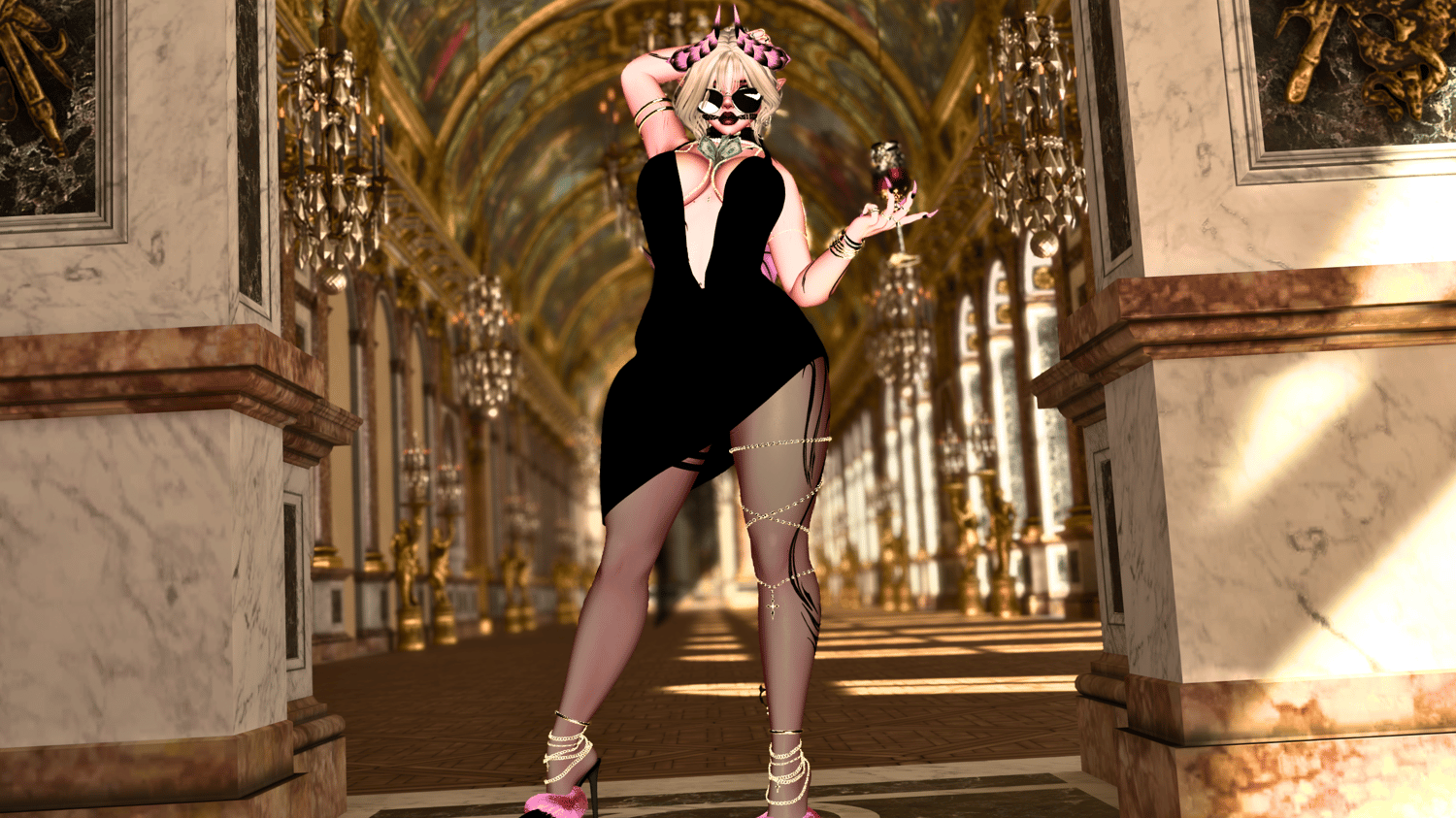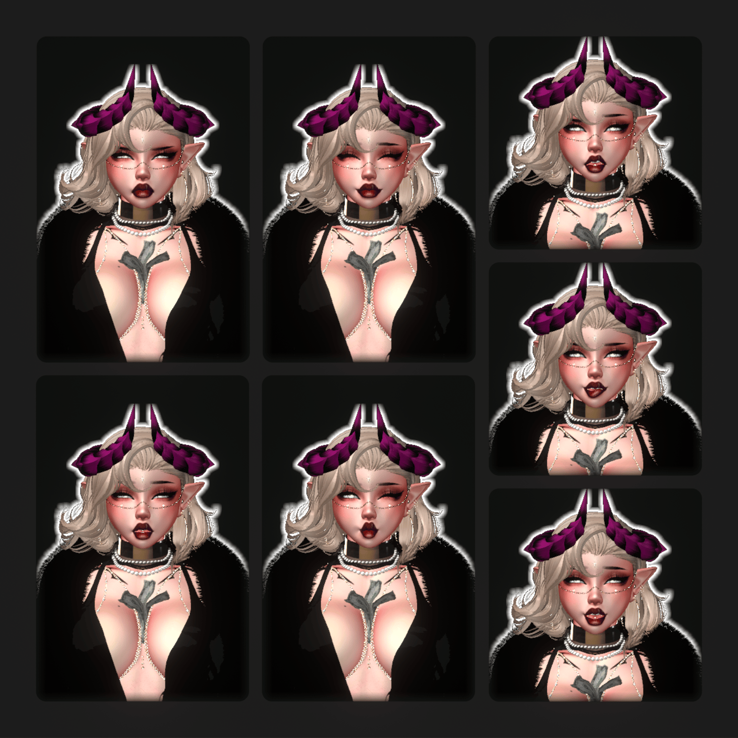 ✁‧‧‧ Toggles ⋮⋮ 3 Misc Clothing, 5 Tops, 4 Bottoms, Stockings, 3 Shoes, Face Crosses, Blindfold, Shades, Glasses, Face Chain, Gag, Cherries, Credit Card, Hoops, Fangs, Teeth Charm, Choker, Pearls, Scarf, Back Necklace, Pearl Harness, Titty Money, S&M Arm Cuff, Arm Cuff, Fur Boa, Bracelets, Watch, Bangles, Gloves, Wedding Ring, October Ring, Basic Rings, Claws, Bell Piercing, Garter, Leg Chains, Ankle Cuffs, Ankle Chains, Toe Rings, Demon Horns, Demon Wings, Demon Tail, 3 Hairstyles, Bangs, Hair Colors, Metal Colors, LOTS of customization, Chaiselounge, Glasses Falling, Expression Lock, Blink Toggle, Necro's Serpents Flows, Wine Glass, Cigarette, Money Fan, Lighting Sliders, Heartbeat, Make It Rain Money, Gun, Gogo Loco, & FaceTracking[OPTIONAL]