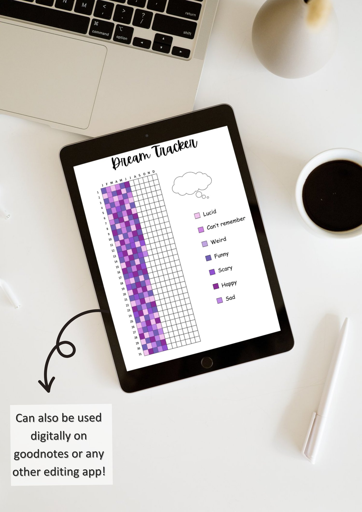 The tracker features a comprehensive yearly grid (1–31 days, J–D months). The layout includes space for customizable legends, which you can use to color-code the type or content of the dream you had each night (e.g., Lucid, Nightmare, Funny, Forgotten). This allows you to effortlessly log and visualize the frequency and nature of your dreams over the entire year. Since this is an instant digital download, you can print this tracker as many times as you need for continued use year after year! Use digitally in GoodNotes or print for detailed physical records.