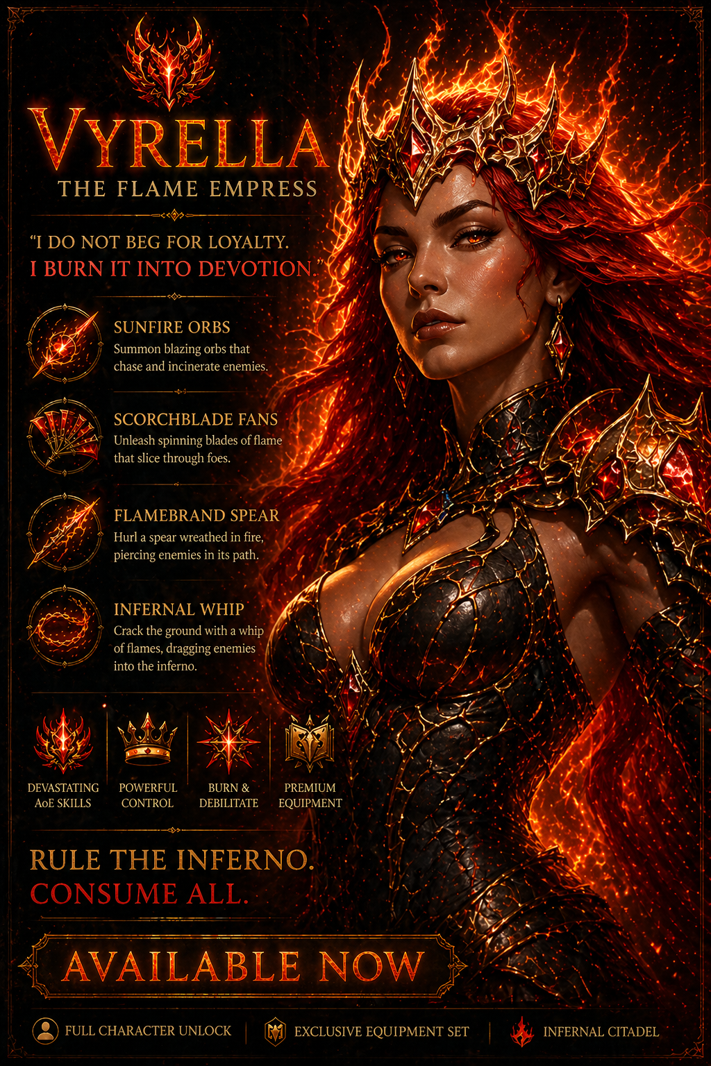 Ruling through fire and absolute dominance, Vyrella β The Flame Empress is a master of control, destruction, and unwavering authority.