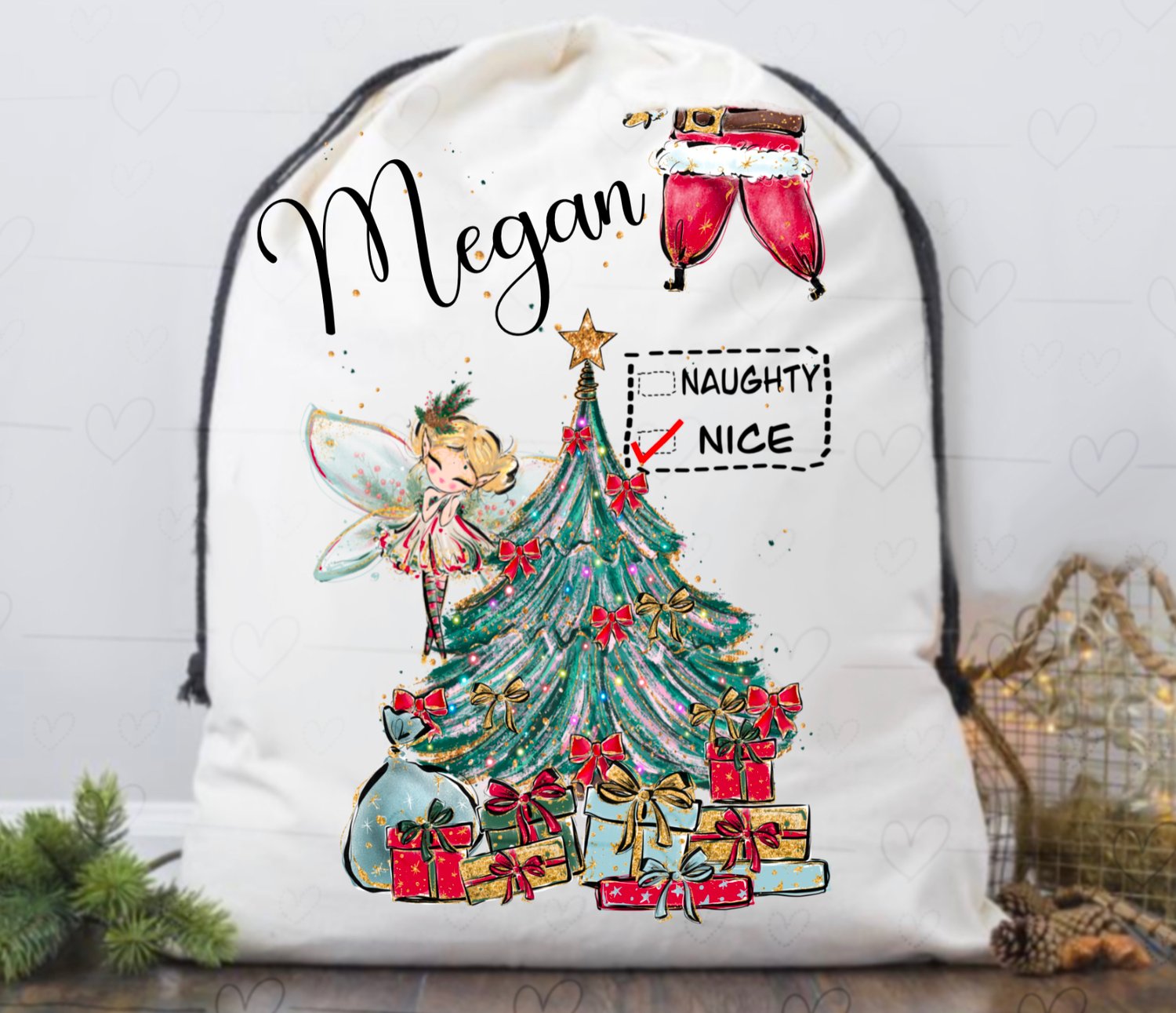 Fairy Santa sack designs. Blonde and brunette fairy with santa disappearing up the chimney