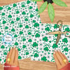Green shamrocks, ribbon bows, daisy flowers and hearts.