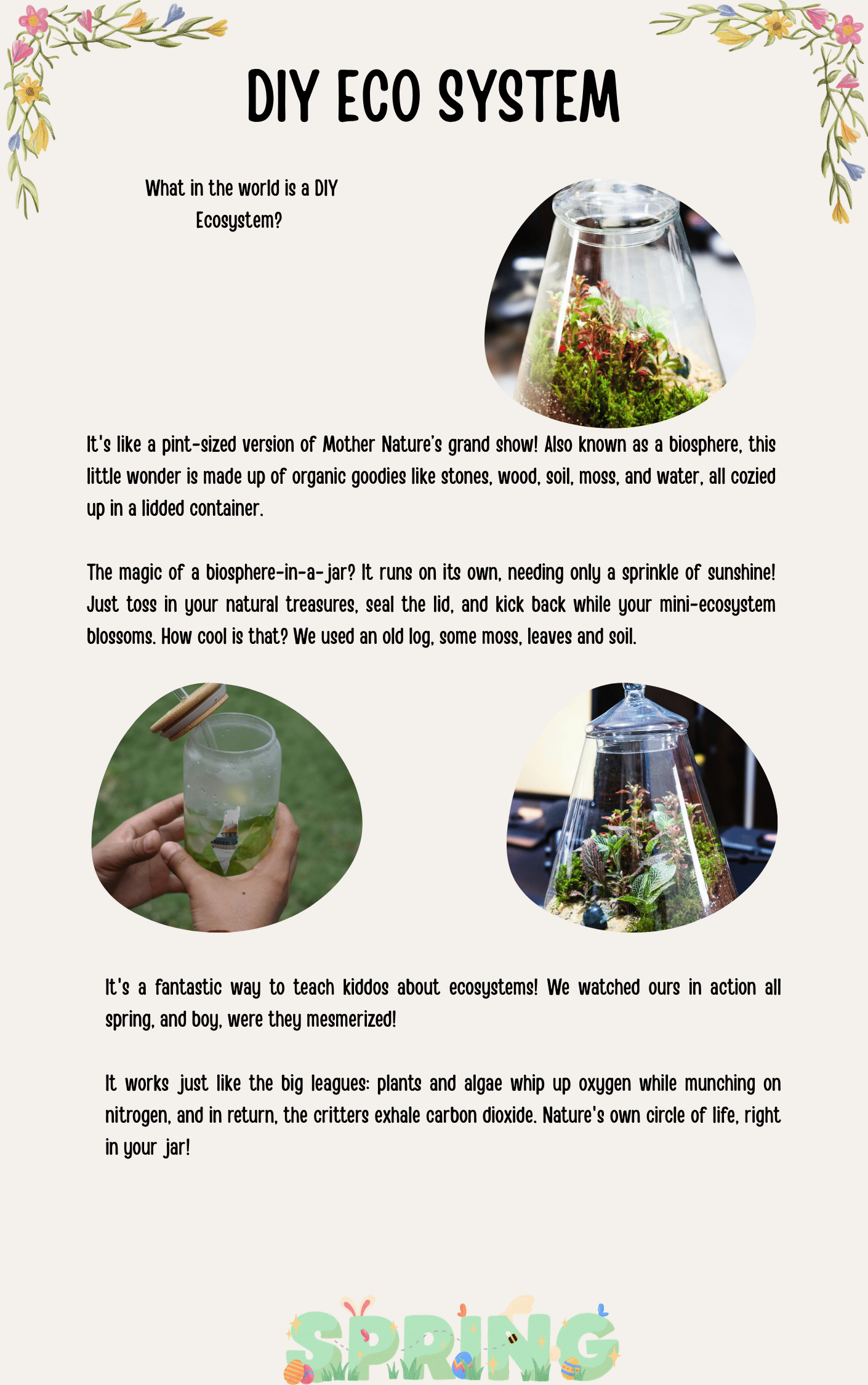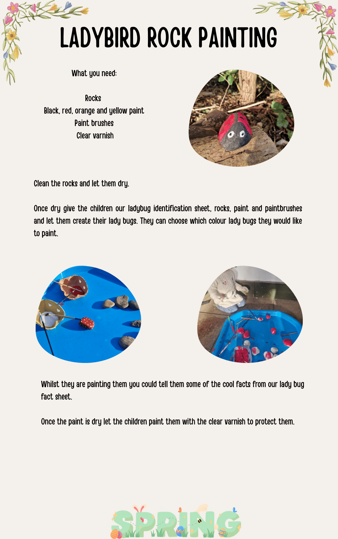 Child‑friendly information and activities exploring plants, insects, birds, and signs of new life.