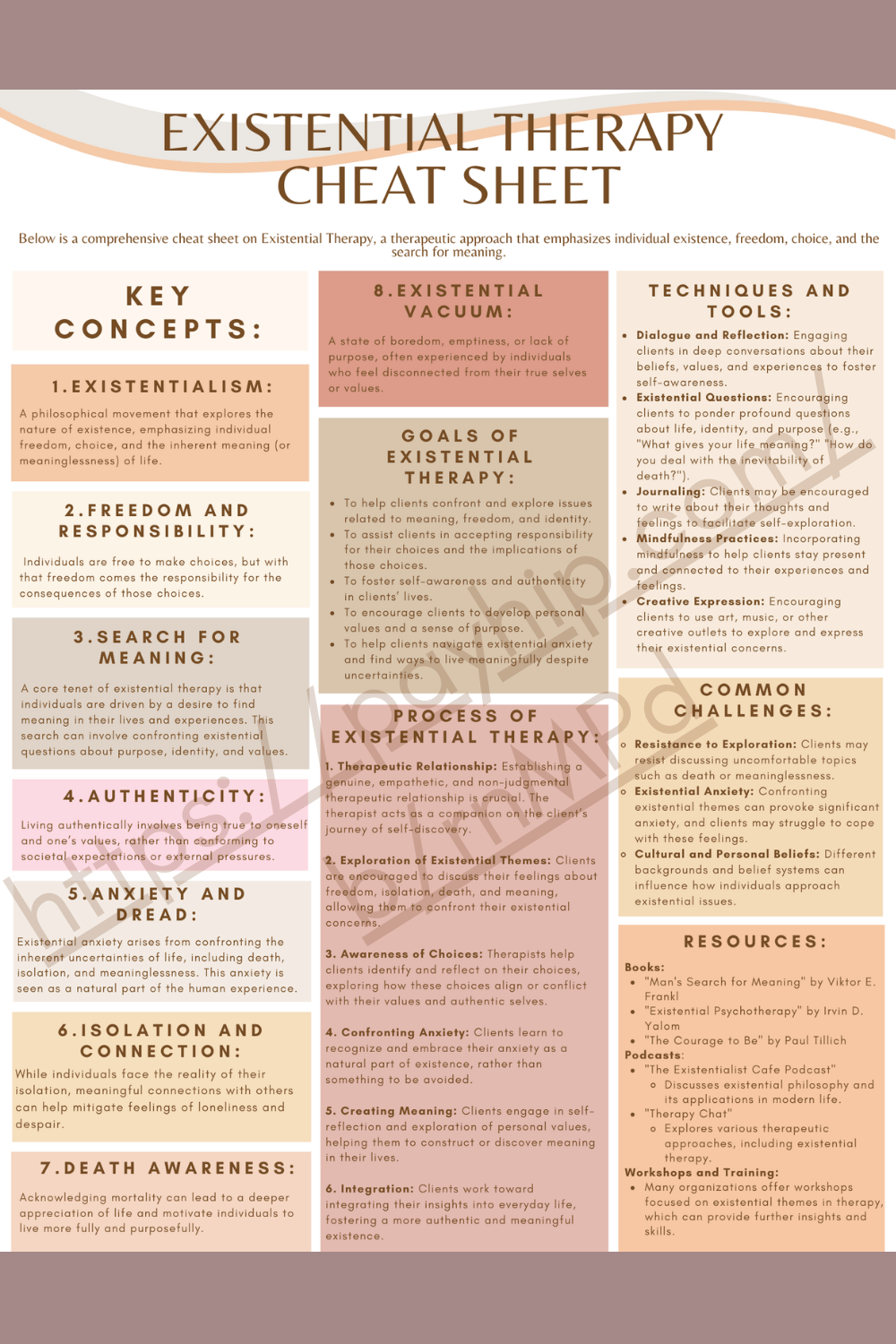 This worksheet offers a comprehensive cheat sheet on Existential Therapy, a therapeutic approach that emphasizes individual existence, freedom, choice, and the search for meaning.