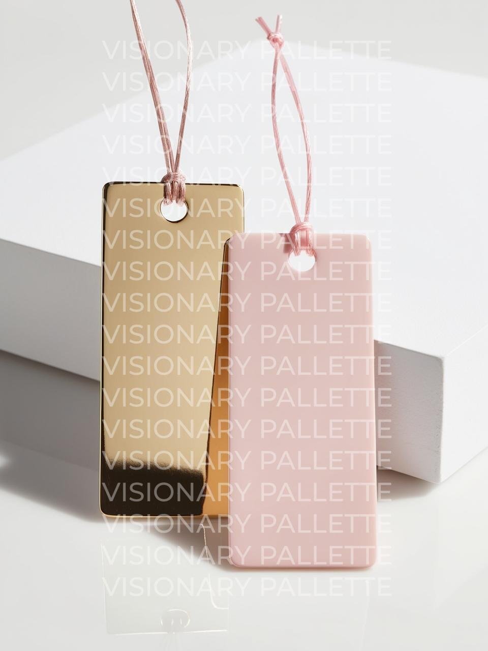 A realistic gold and pink vertical rectangle hair hang tags with a pink string through the hole