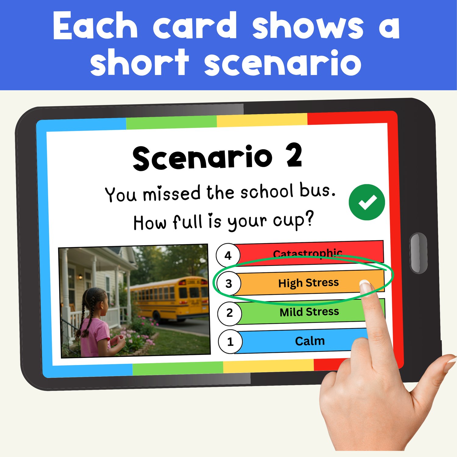 ✔ Multiple-choice format: students pick the correct stress level