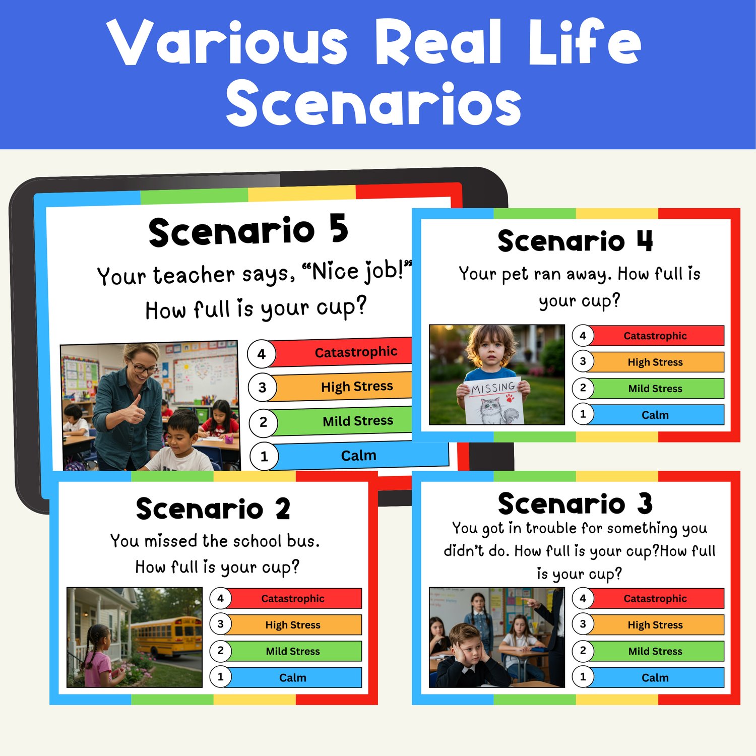 Students will read short, real-life situations and decide how “full their cup” feels—ranging from calm to catastrophic. Perfect for building emotional regulation, problem size awareness, and SEL vocabulary in a visual, engaging format.