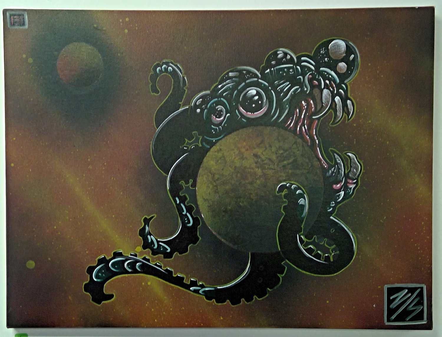 This crazy Effer can be yours today. That doesn't mean that you support planet eating. But if you want to, you can tell people that. This painting measures 18" x 24". It's a spray paint background with acrylic and paint maker on ol' Barney