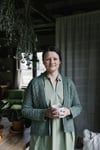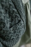 This top-down, cabled cardigan, named for “the beginning” in Finnish, features inset slit pockets. The front’s long, dramatic V-shape meets at the waist. Reverse stockinette triangles at the underarm create Alku’s A-line shaping.