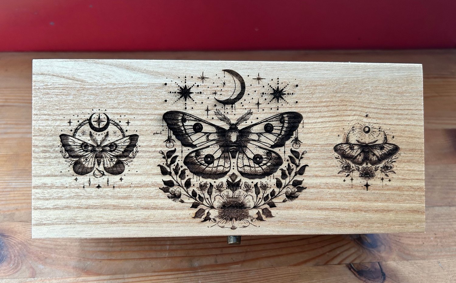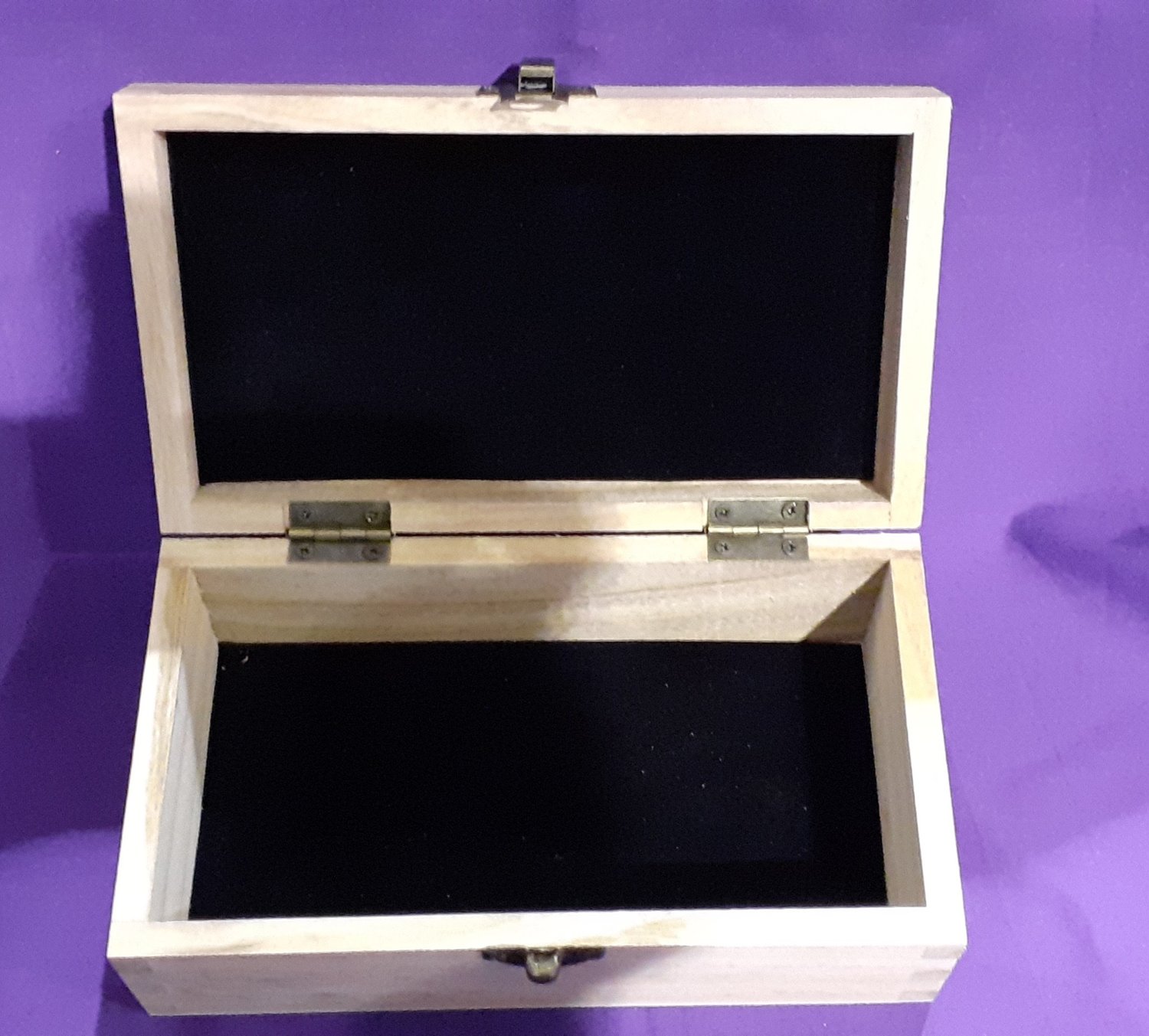 Large Hand decorated by laser with a durable laquer finish,velvet lined (Black or red) to keep what’s inside protected ..this box is great for anyone who collects crystals or cards.. and wants to keep them safe..