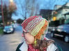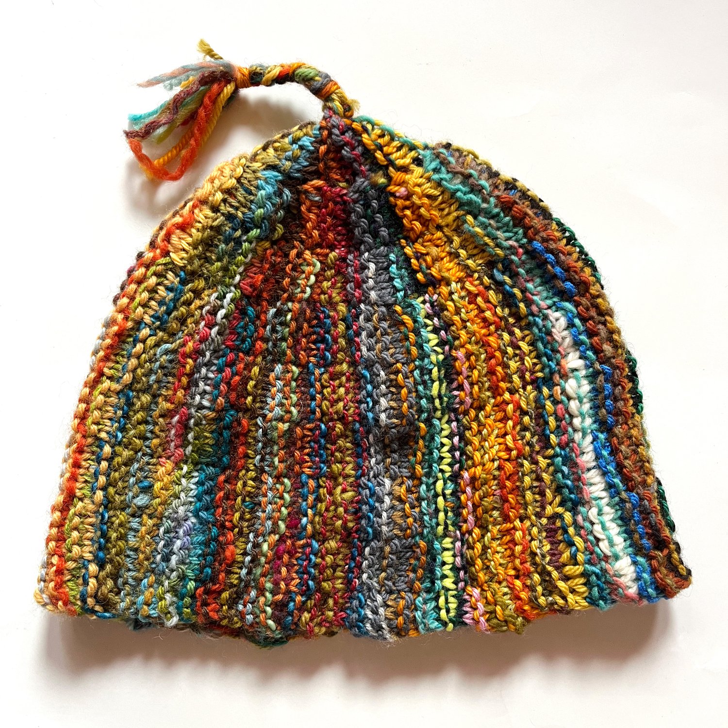 This hat concept was based my Slanted & Enchanted scarf design, which is meant for using up varying lengths of leftover scraps of yarn. The scarf is, well, slanted, because there are short rows created by some of the strands not making it to the end of the row. I realized that this concept could be turned into a hat by the narrow side becoming the crown. It couldn’t be as scrappy and freeform as the scarf though, since it needed to function as a hat, and randomly placed short rows would result in pointed crowns and wonky shapes!