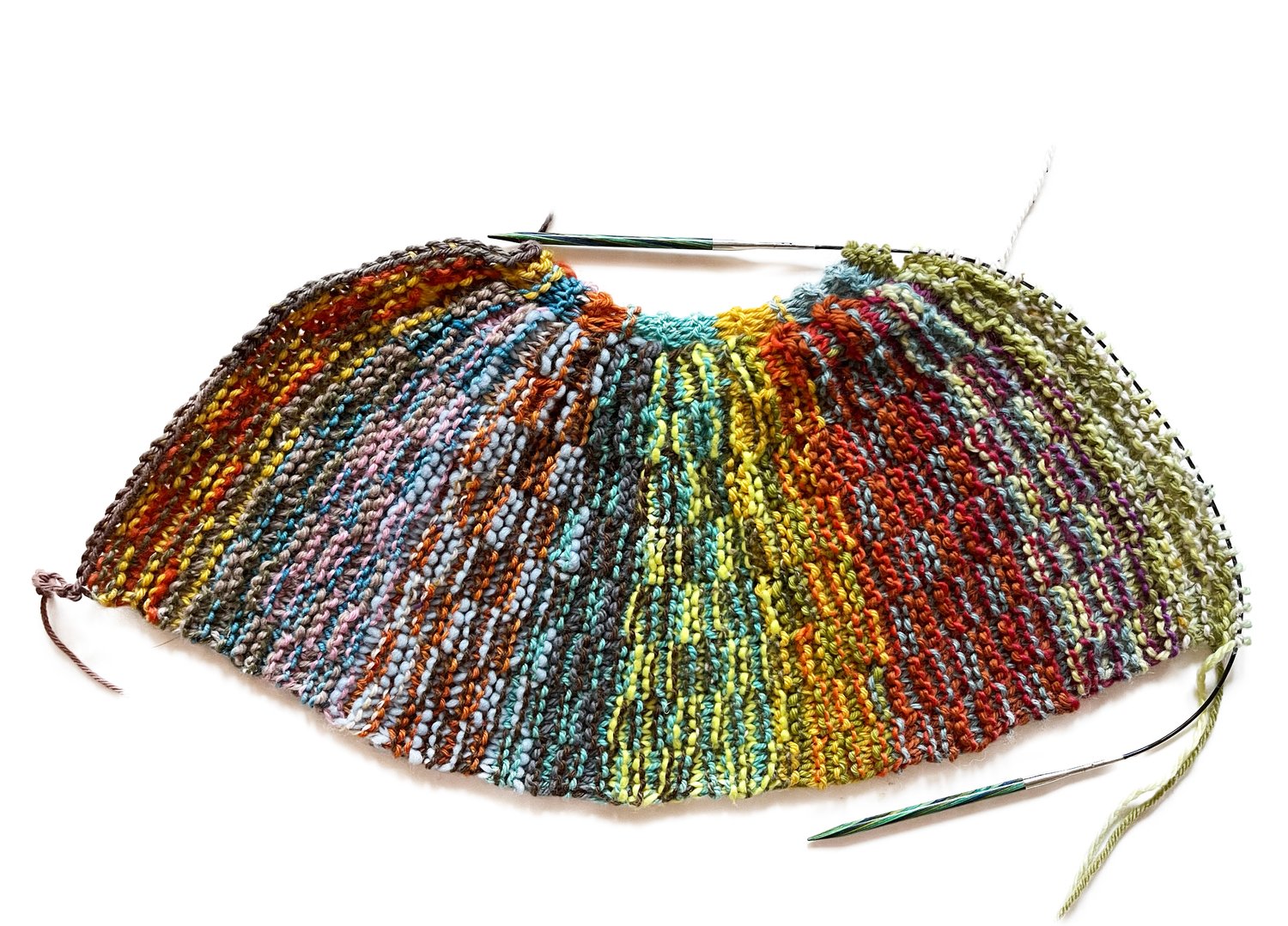 So I designed it two different ways: one that’s more similar to the scarf, using two circular needles which slide in the stitches, same as the scarf, meant for lots of quite short scraps of yarn leftovers. Then I made a variation, less similar to the scarf, meant for leftover mini-balls of yarn, which just uses one pair of needles, worked more normally. This version creates blended stripes, as you work with three colors at a time throughout.