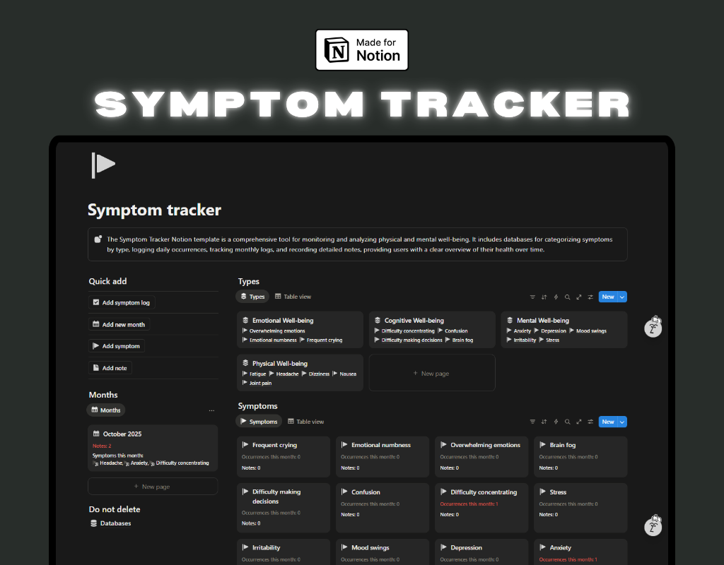 Feeling lost when trying to explain your health to a doctor? π© The Symptom Tracker Notion Template is your personal health journal, designed to help you understand and manage your well-being. This simple yet powerful tool turns your daily health experiences into clear, actionable insights, so you can stop guessing and start sharing precise data with your healthcare team.