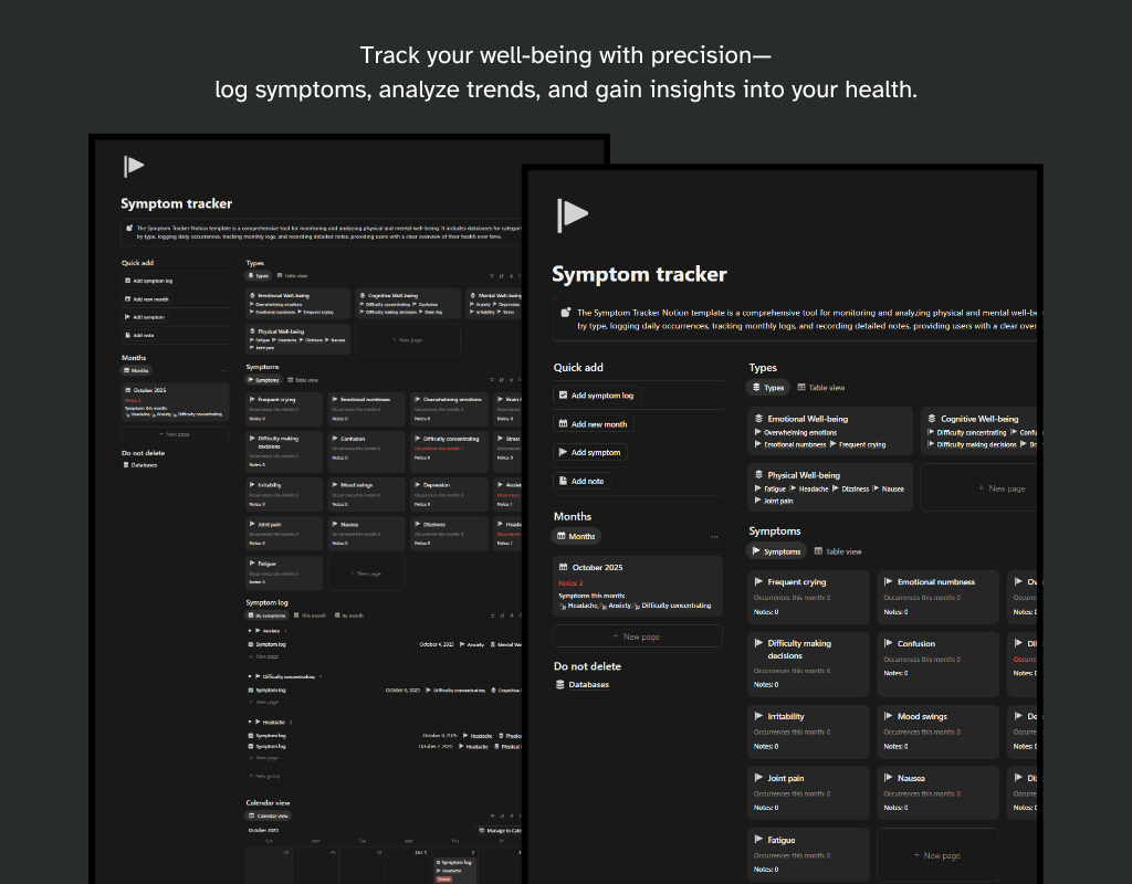 - See the Big Picture: Gain a holistic view of your health by easily tracking both physical and mental symptoms. The template helps you connect the dots between how you feel, what you do, and the patterns that emerge.