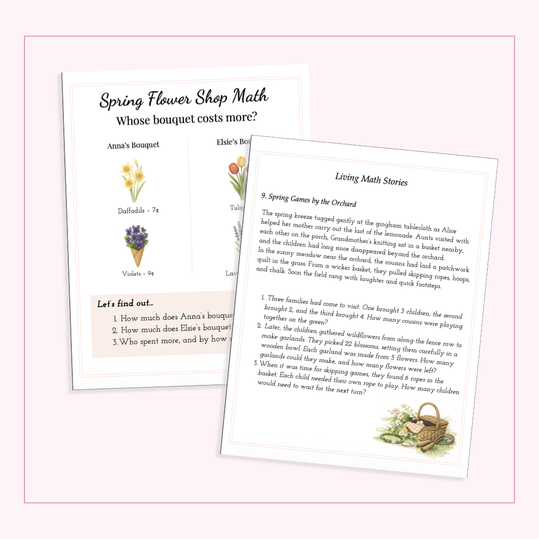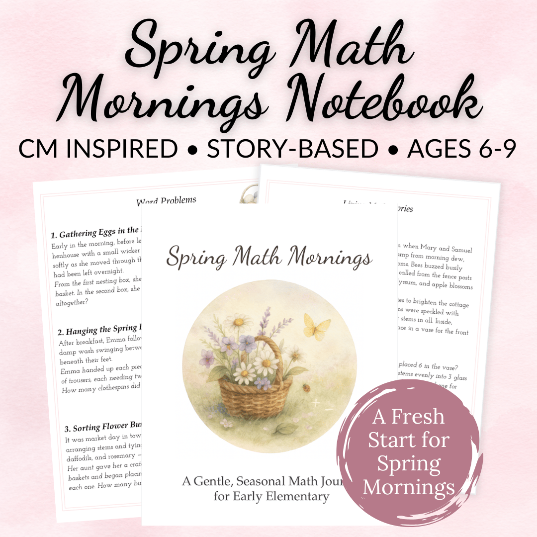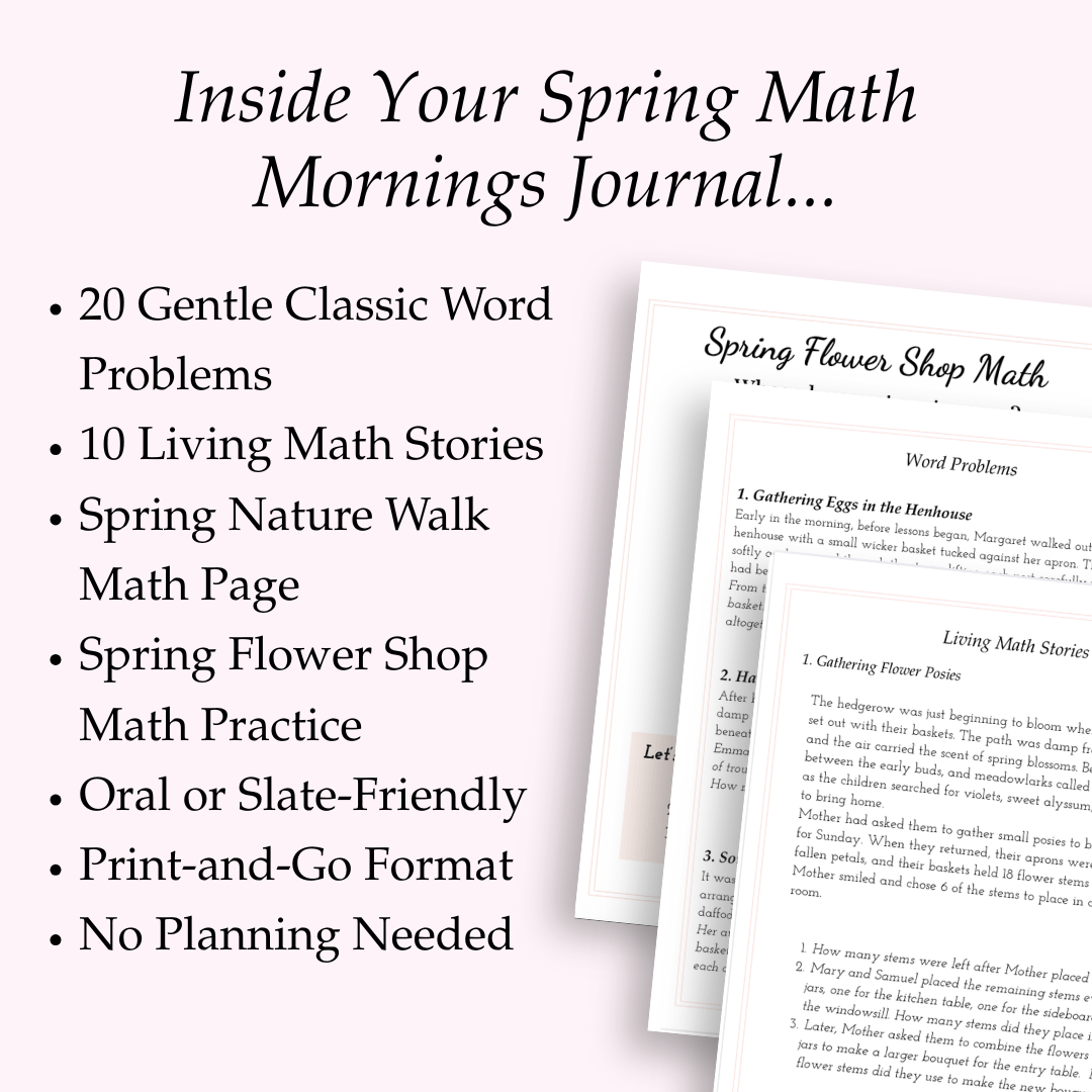 This gentle, seasonal journal draws your child into living math through simple spring stories: garden chores, nature walks, budding flowers, baby animals, and the quiet, hopeful tasks that fill these months.