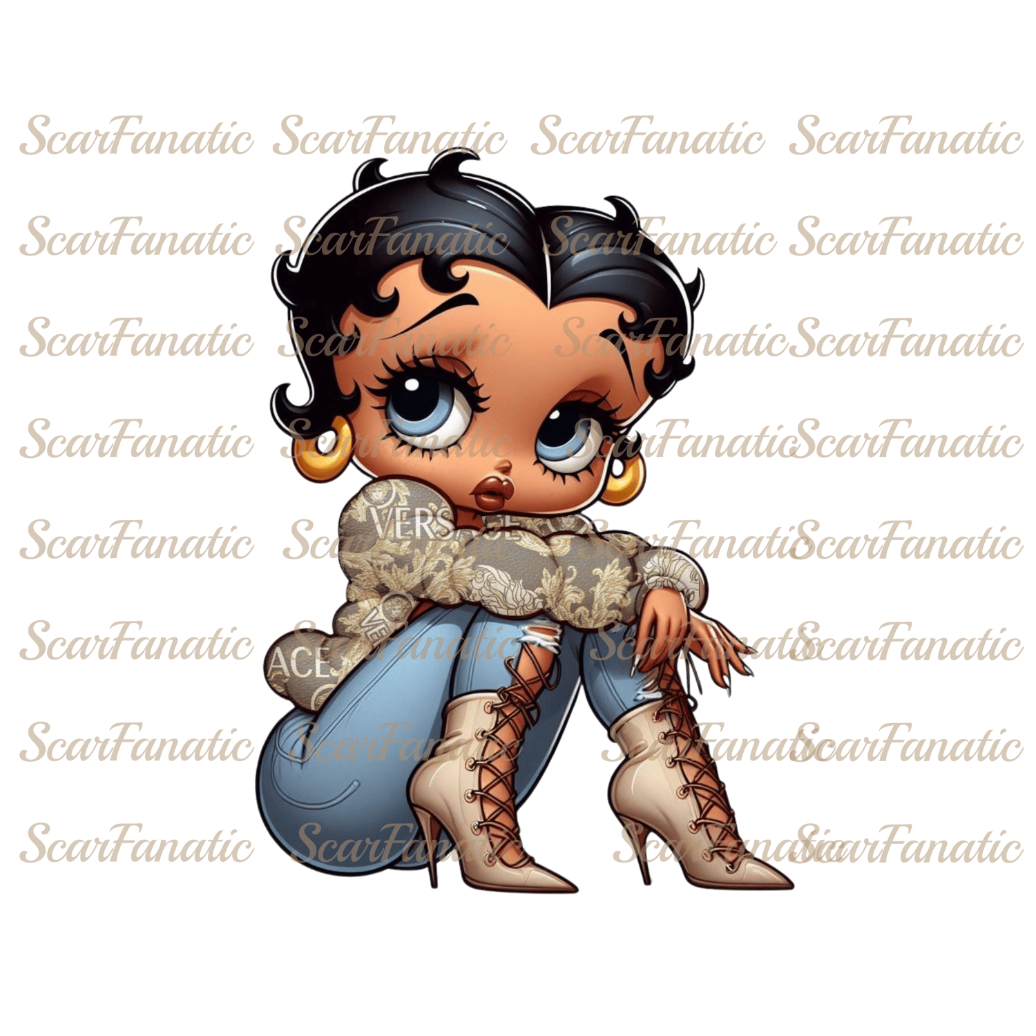 Betty Boop w blue eyes in Vsc jacket, blue jeans, high heel boots, Sublimation, PNG, DTF, 300DPI, high resolution