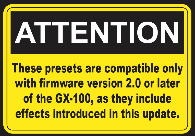 >>> Attention! These presets are compatible only with firmware version 2 or later of the GX-100, as they include effects introduced in this update. <<<