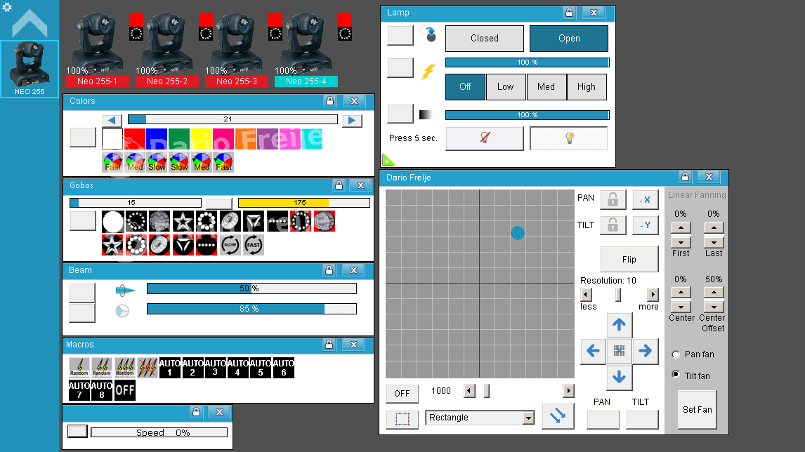Librería para Freestyler DMX del Cabezal Móvil "Neo 255" de American Pro (el de lámpara, de 11CH, que tiene prisma y foco).