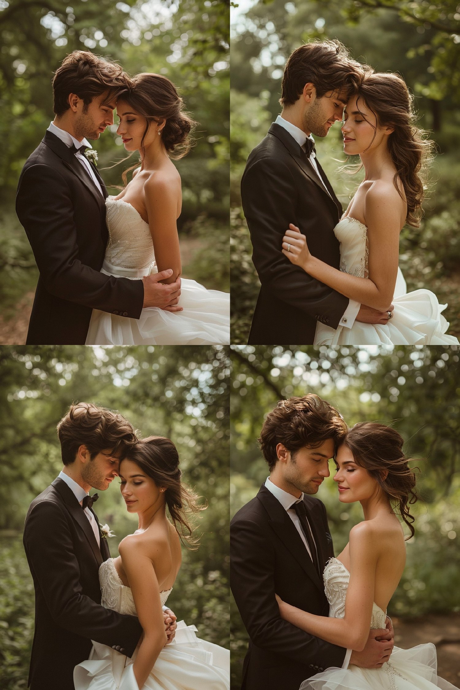 Create premium, ultra-realistic cinematic wedding portraits of a bride and groom standing together in Hyde Park, London. The bride wears a strapless elegant wedding dress with a fitted bodice and flowing skirt, while the groom wears a classic black tailored suit. They stand near the Serpentine, with soft London light, gentle wind moving the bride’s dress, and lush park scenery in the background. Perfect for fashion editorial-style wedding photography, cinematic storytelling, or high-end romantic visuals. Rendered with shallow depth of field, 85mm lens, ultra-detailed textures, and realistic lighting. Keywords: wedding portrait, Hyde Park, cinematic photography, romantic couple, fashion editorial, ultra-realistic, high-detail, bridal fashion, AI art.