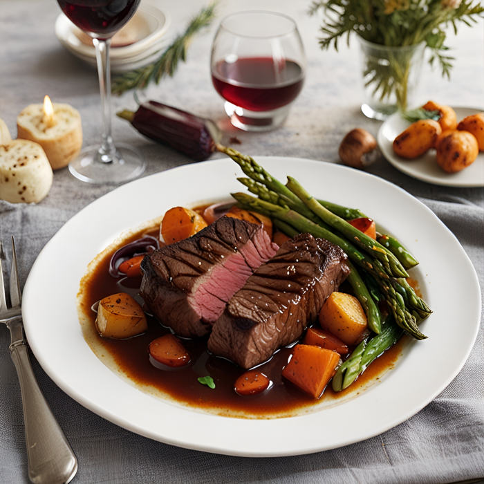 This exquisite image captures a beautifully plated gourmet meal, featuring a perfectly seared steak accompanied by an assortment of colorful, roasted vegetables, including tender asparagus, carrots, and potatoes. The rich, glossy sauce adds a touch of sophistication, while two glasses of red wine enhance the meal's elegance, providing a luxurious dining experience. The fine attention to detail in the presentation, combined with the clean white plates and soft table setting, emphasizes the refined atmosphere of the meal, making it an inviting and mouthwatering portrayal of fine dining and culinary artistry.