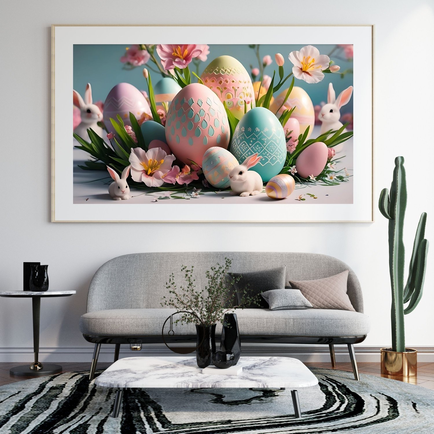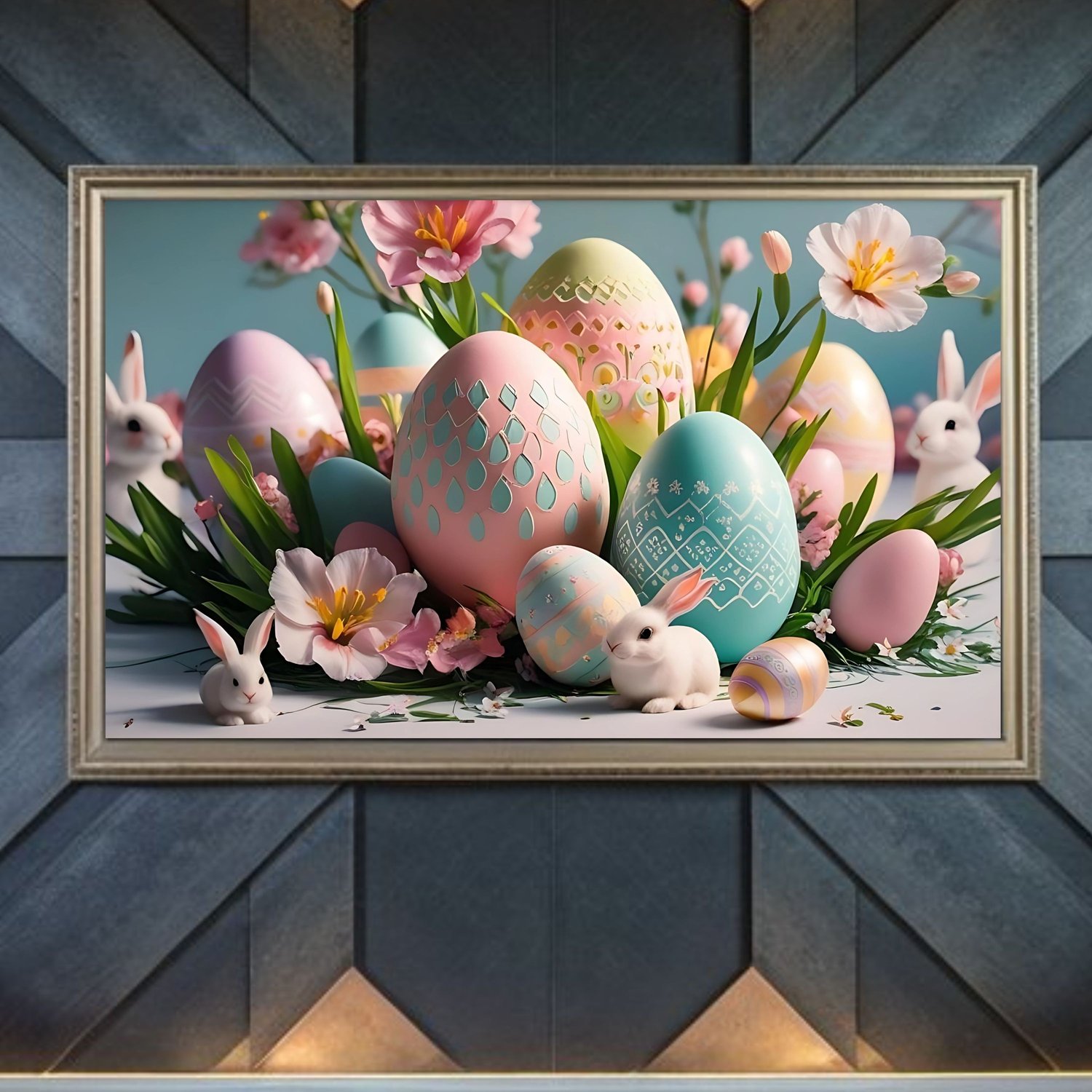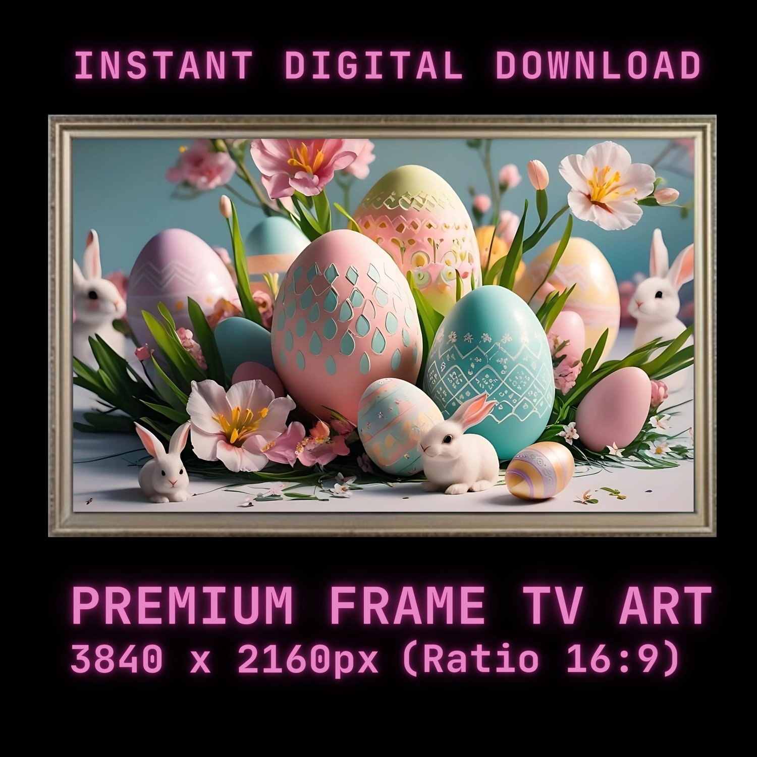 Celebrate the season with this Easter Frame TV Art—a vibrant fusion of whimsical bunnies, sleek modern eggs, and soft spring hues! This digital artwork features a cheerful Easter bunny nestled among abstract pastel eggs, set against a clean, minimalist backdrop. Perfect for Samsung Frame TVs, tablets, or screens, it’s a fresh, contemporary twist on classic Easter charm that delights kids and adults alike!