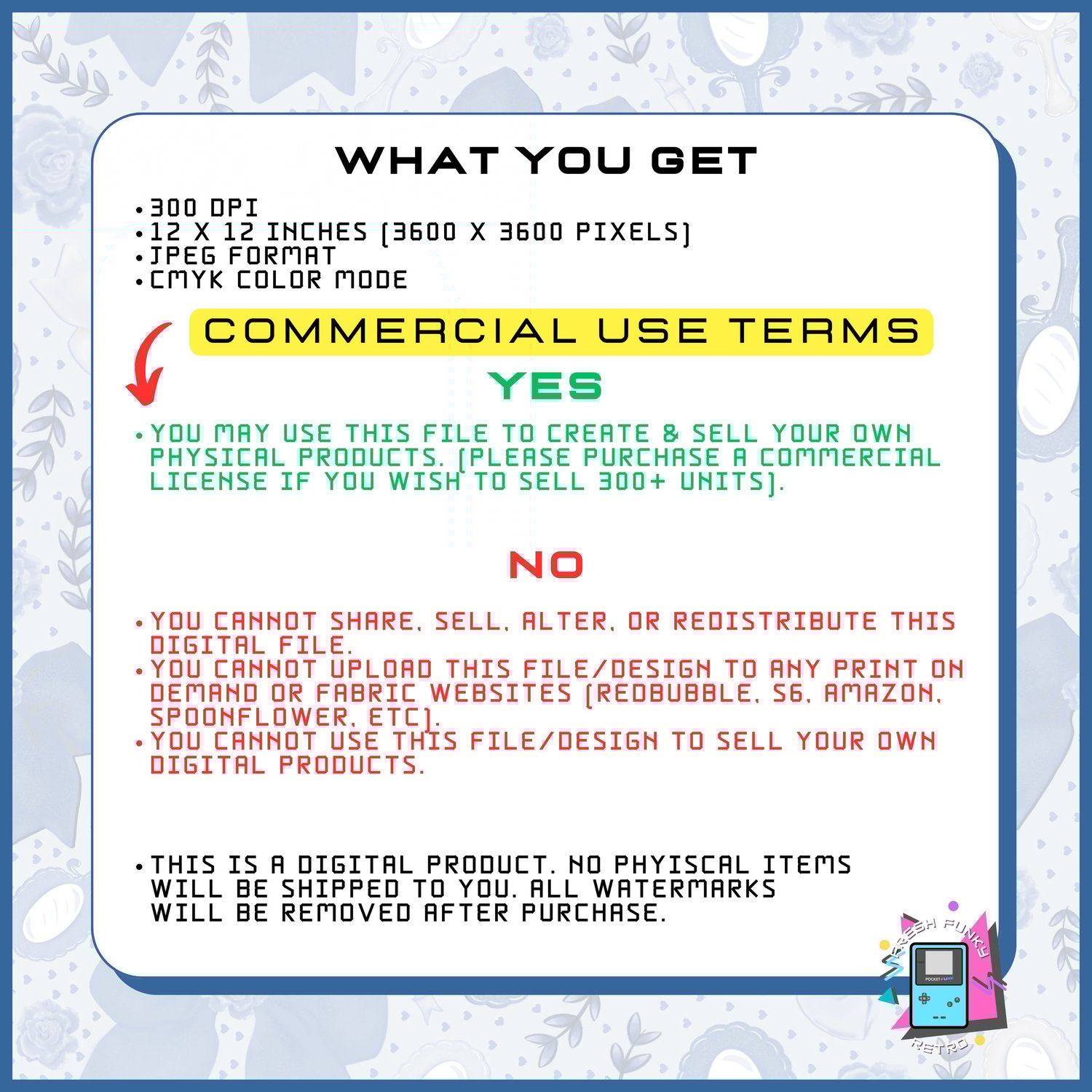 - You cannot upload this file/design to any print on demand or fabric websites (Redbubble, S6, Amazon, Spoonflower, etc).