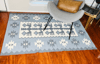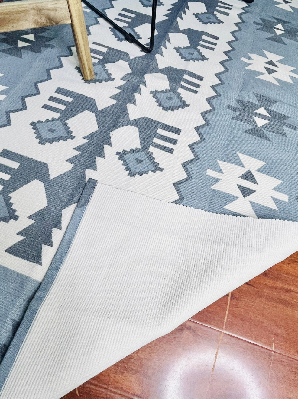 The intricate pattern, featuring stylized "Aztec" inspired motifs in a serene palette of soft blues and creamy whites, creates a focal point that's both eye-catching and harmonious. The rhythmic repetition of shapes adds a sense of depth and visual intrigue, making it a conversation starter in any room.