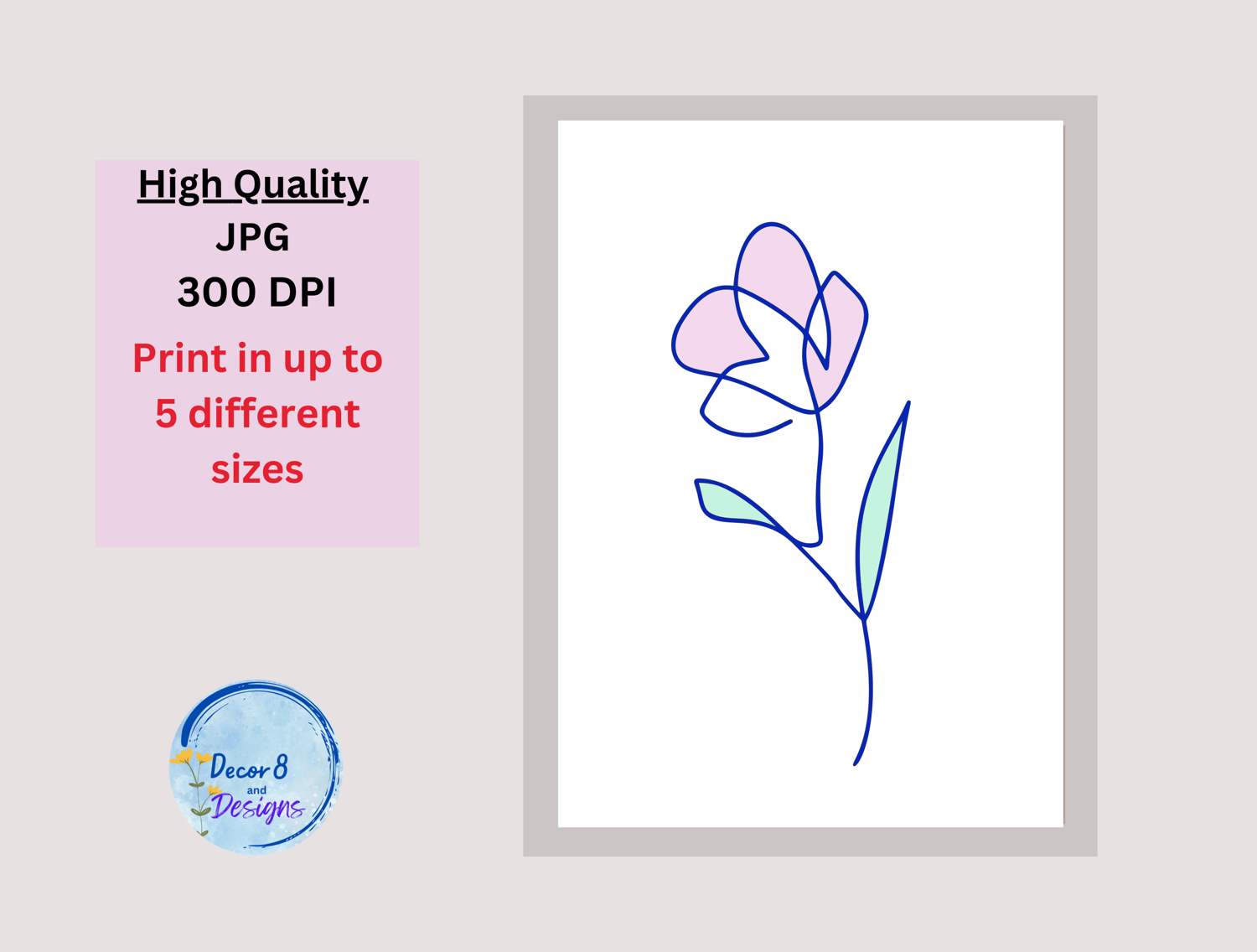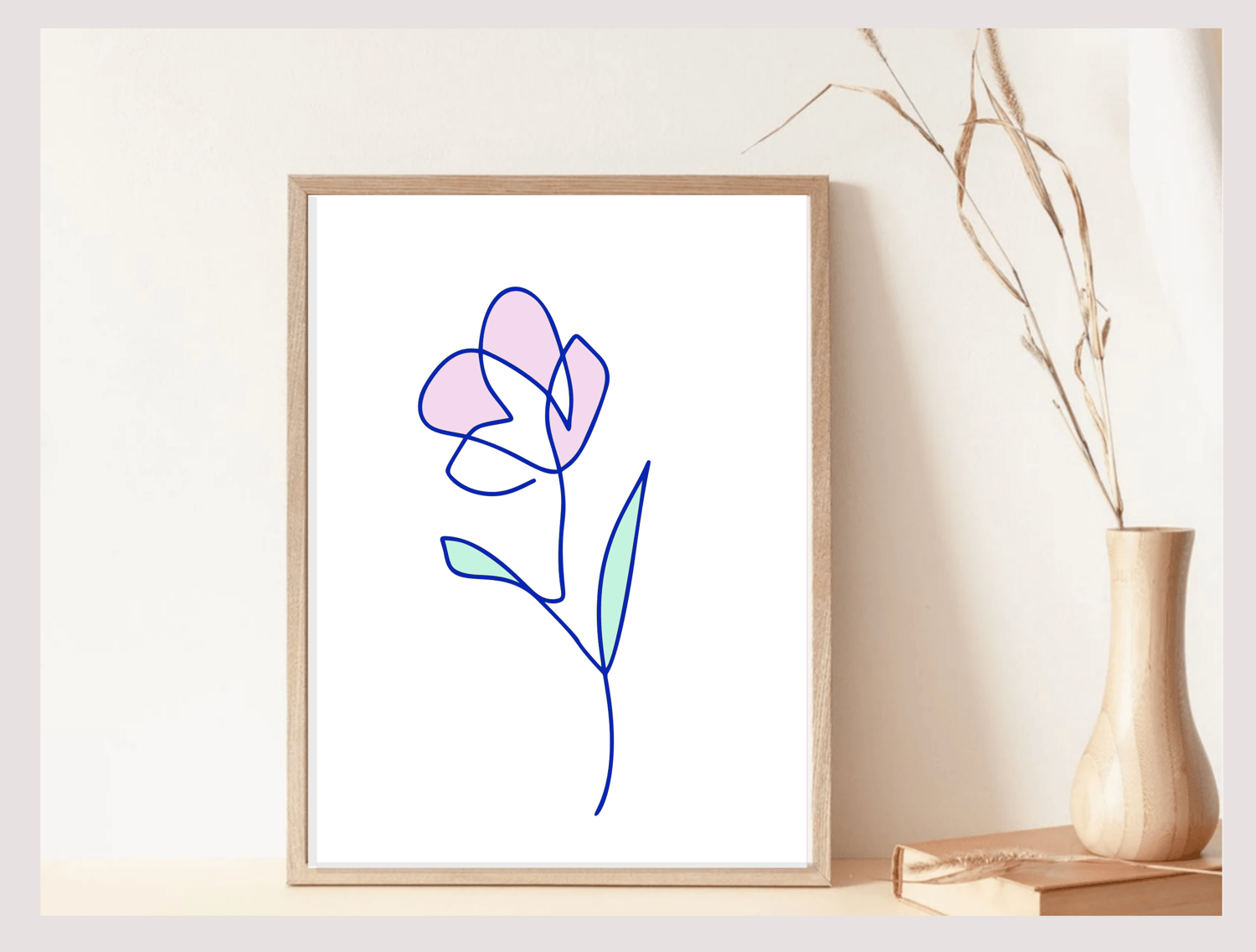 A simple but beautiful fine line flower print in pink and green with a blue outline. The colors work so well together and will elevate your perfect space - kid's room, nursery, living room, dining room, entrance, kitchen, dorm room or even bathroom. A one-line Instant Download that merges Minimalist sophistication with the allure of Floral Wall Art. Transform your living space with this Minimalist Wall Art decor.