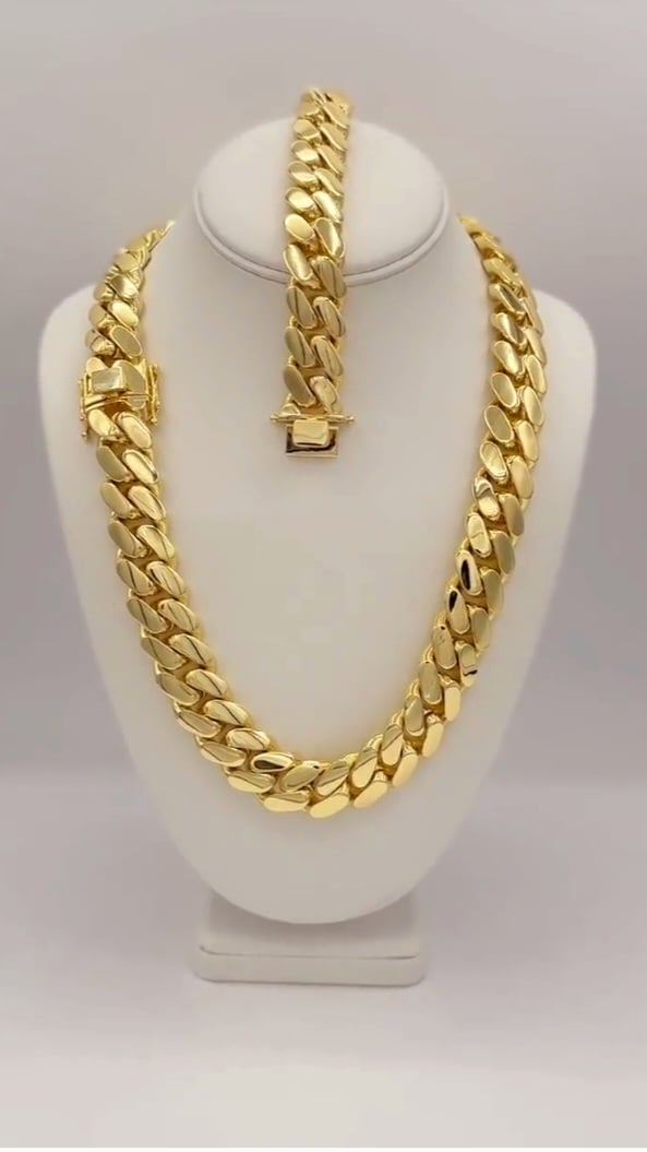 This beautiful Cuban link chain set is crafted from high-quality brass and plated with 14K or 18K gold using a five-layer plating process for enhanced resistance to tarnishing and long-lasting brilliance. The substantial, heavyweight feel and versatile design make it suitable for any occasion, from everyday wear to formal events