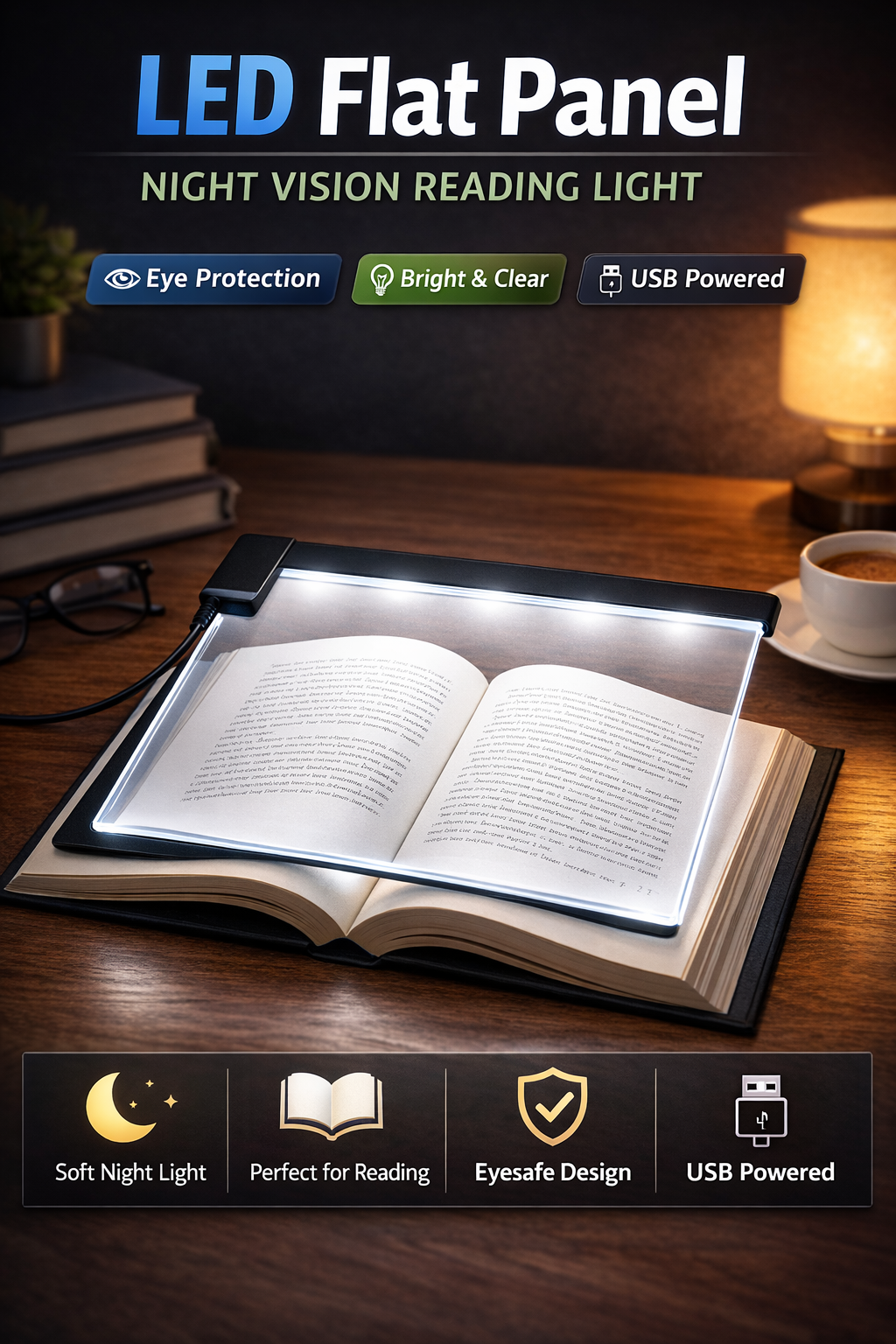 The LumiCare™ LED Flat Panel Reading Light is designed with soft, eye-protective lighting that reduces glare and fatigue, making it perfect for students, night readers, and late-night study sessions.