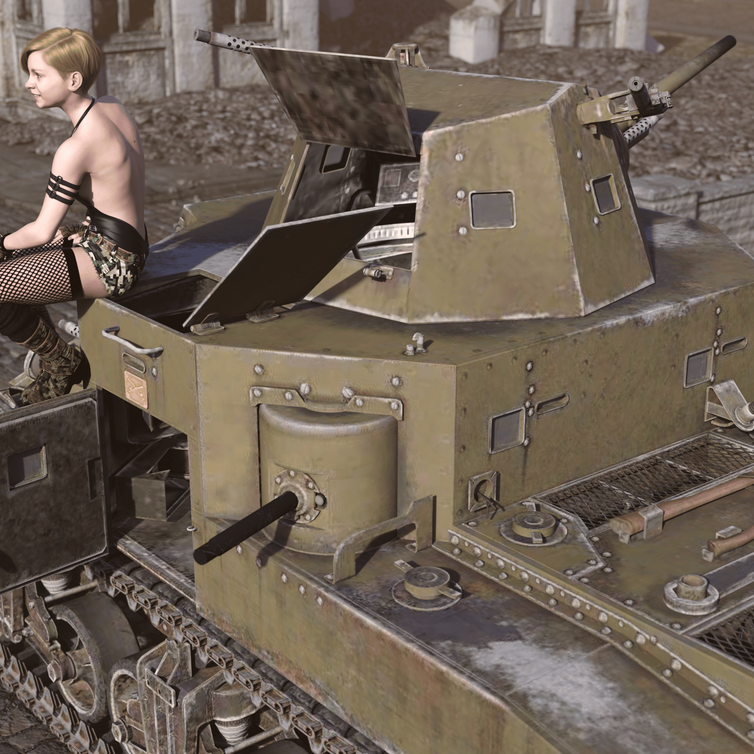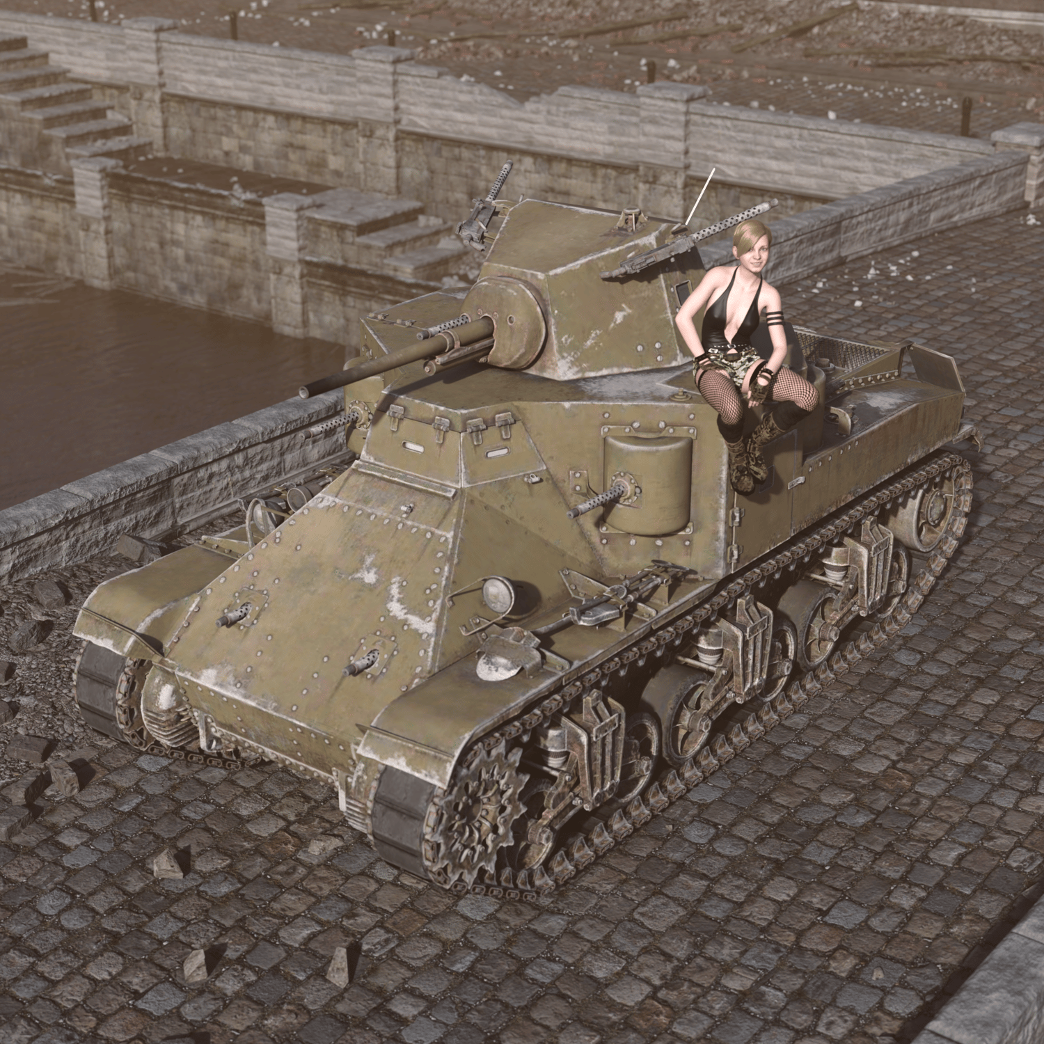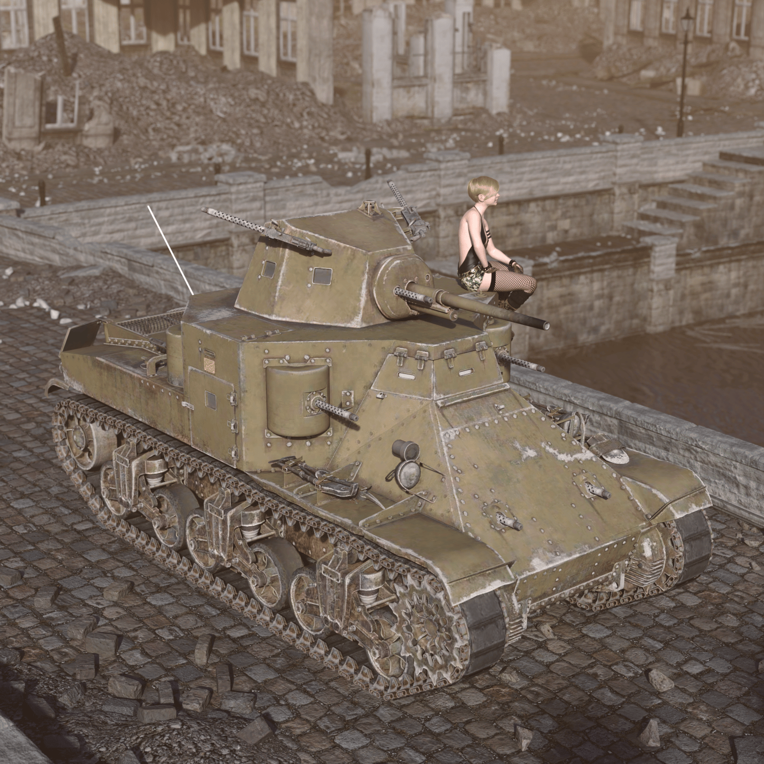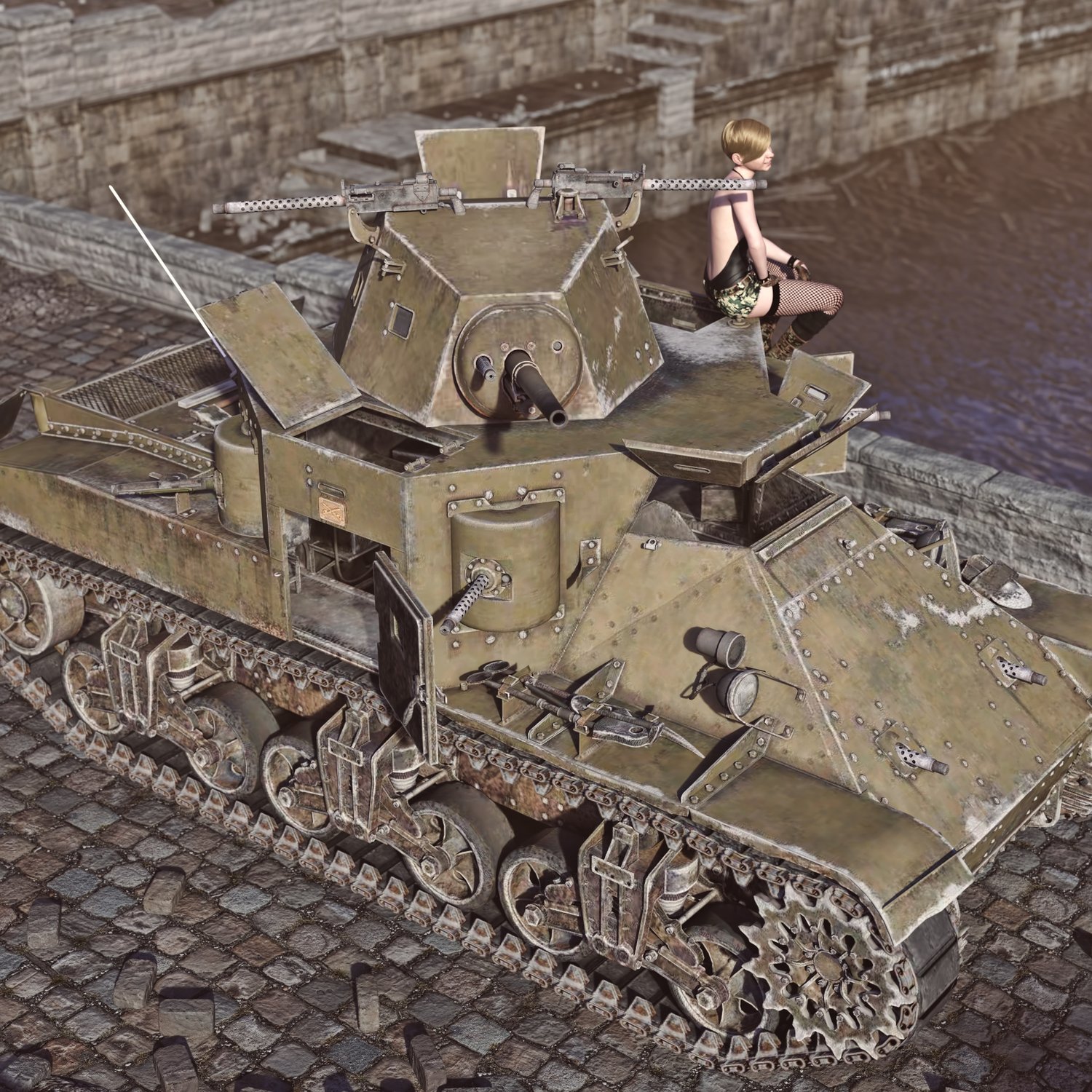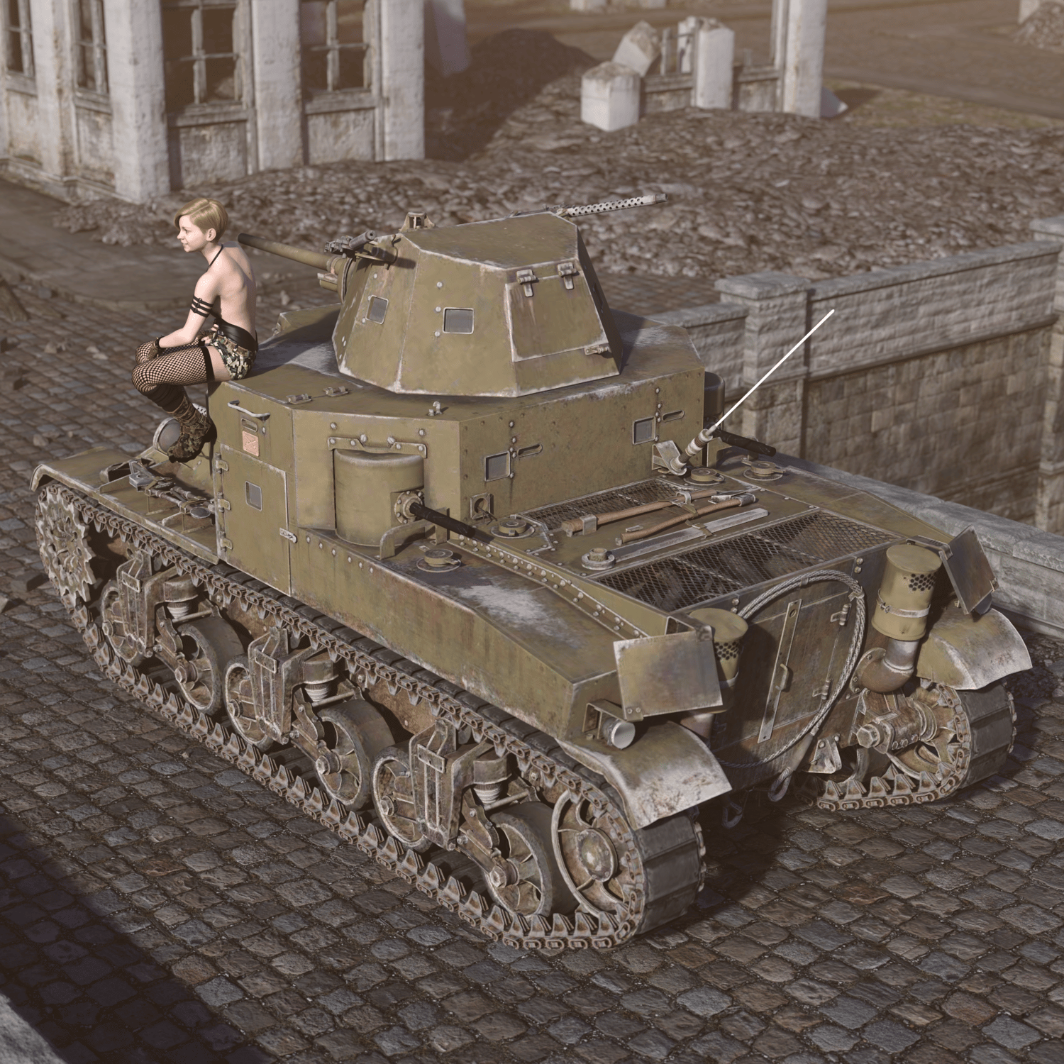 A cool looking early US tank, developed and produced right before WW2. Sturdy, good looking and a bit intimidating :) The thought was the mode machine guns the merrier, so it has guns on all sides. With some modifications this tank served during the whole war, though in many places was obsolete. Front hatches are rigged for a faster driver mount. Turret and it's MGs are rigged, so is the main gun. side machineguns on turrets are rigged too for more realistic pics.