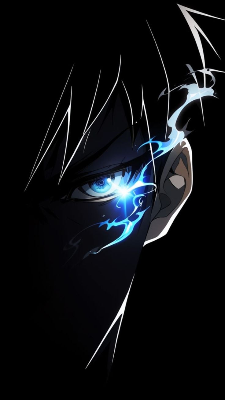 A powerful glowing blue anime eye emerging from deep darkness. ⚡👁️