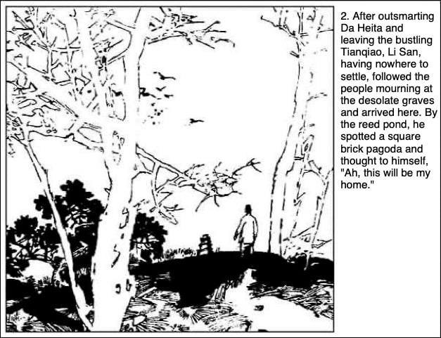 2. After outsmarting Da Heita and leaving the bustling Tianqiao, Li San, having nowhere to settle, followed the people mourning at the desolate graves and arrived here. By the reed pond, he spotted a square brick pagoda and thought to himself, "Ah, this will be my home."