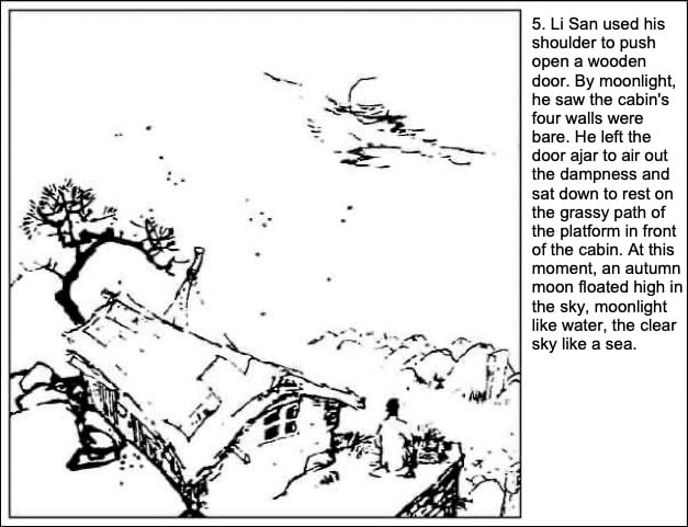 5. Li San used his shoulder to push open a wooden door. By moonlight, he saw the cabin's four walls were bare. He left the door ajar to air out the dampness and sat down to rest on the grassy path of the platform in front of the cabin. At this moment, an autumn moon floated high in the sky, moonlight like water, the clear sky like a sea.