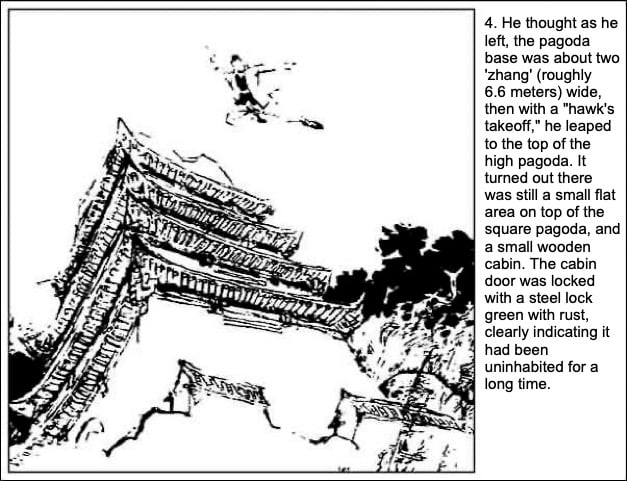 4. He thought as he left, the pagoda base was about two *zhang* (roughly 6.6 meters) wide, then with a "hawk's takeoff," he leaped to the top of the high pagoda. It turned out there was still a small flat area on top of the square pagoda, and a small wooden cabin. The cabin door was locked with a steel lock green with rust, clearly indicating it had been uninhabited for a long time.