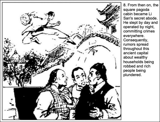 8. From then on, the square pagoda cabin became Li San's secret abode. He slept by day and operated by night, committing crimes everywhere. Consequently, rumors spread throughout this ancient capital about wealthy households being robbed and rich people being plundered.