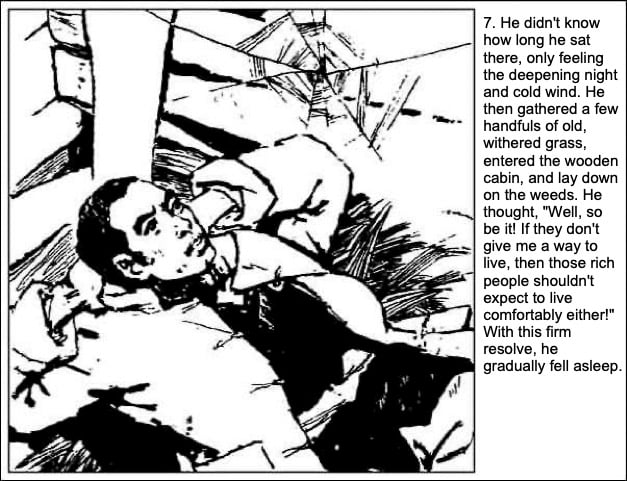 7. He didn't know how long he sat there, only feeling the deepening night and cold wind. He then gathered a few handfuls of old, withered grass, entered the wooden cabin, and lay down on the weeds. He thought, "Well, so be it! If they don't give me a way to live, then those rich people shouldn't expect to live comfortably either!" With this firm resolve, he gradually fell asleep.