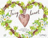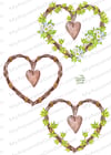 Boho style heart-shaped wreaths with wooden hearts, white flowers, leaves