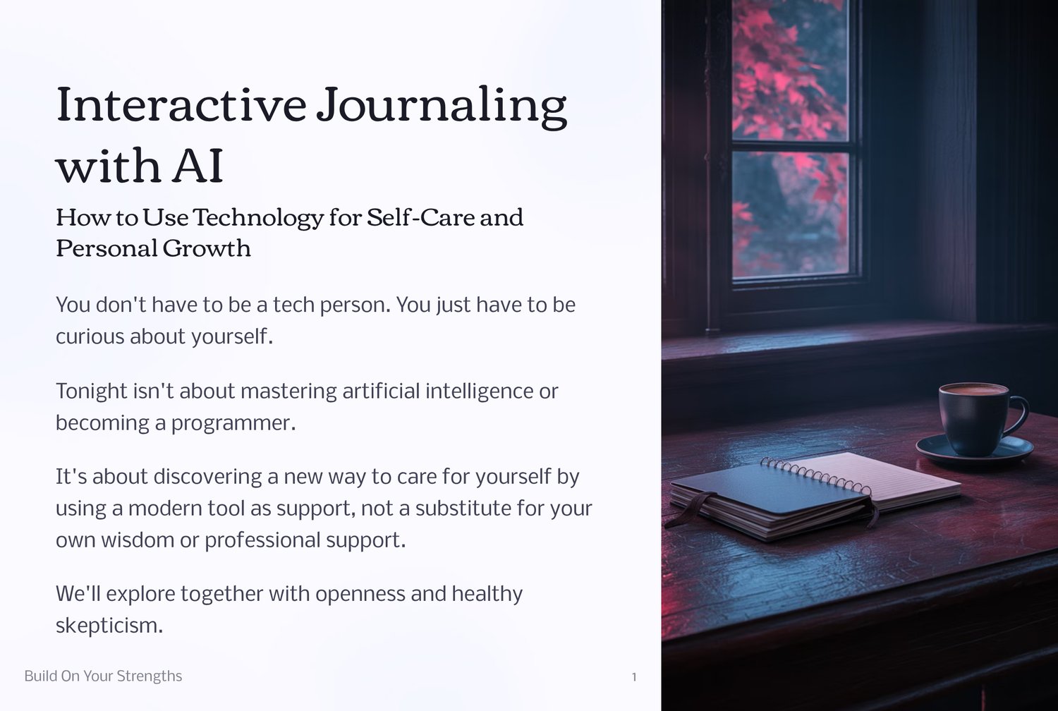 This workshop treats AI as what it is: another self-care tool to support your wellbeing, not replace human connection or professional care.