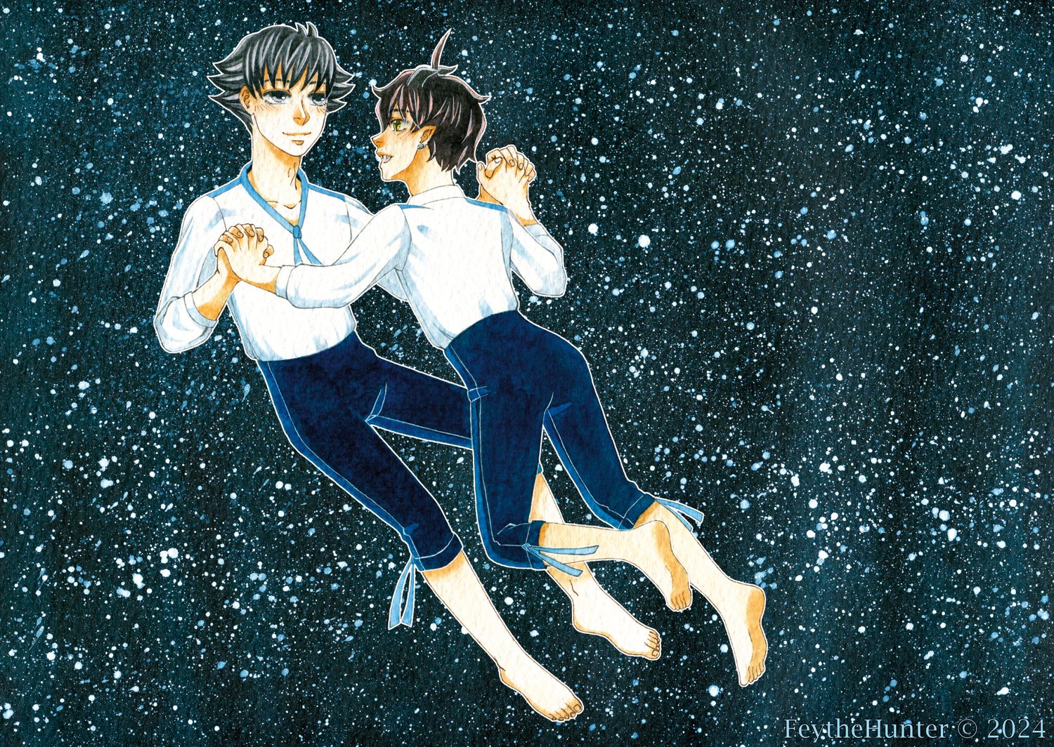 Ein verträumtes Motiv mit Sternenhimmel und Lucas und Adrian, die beiden Hauptcharaktere aus "Zwischen zwei Seiten".