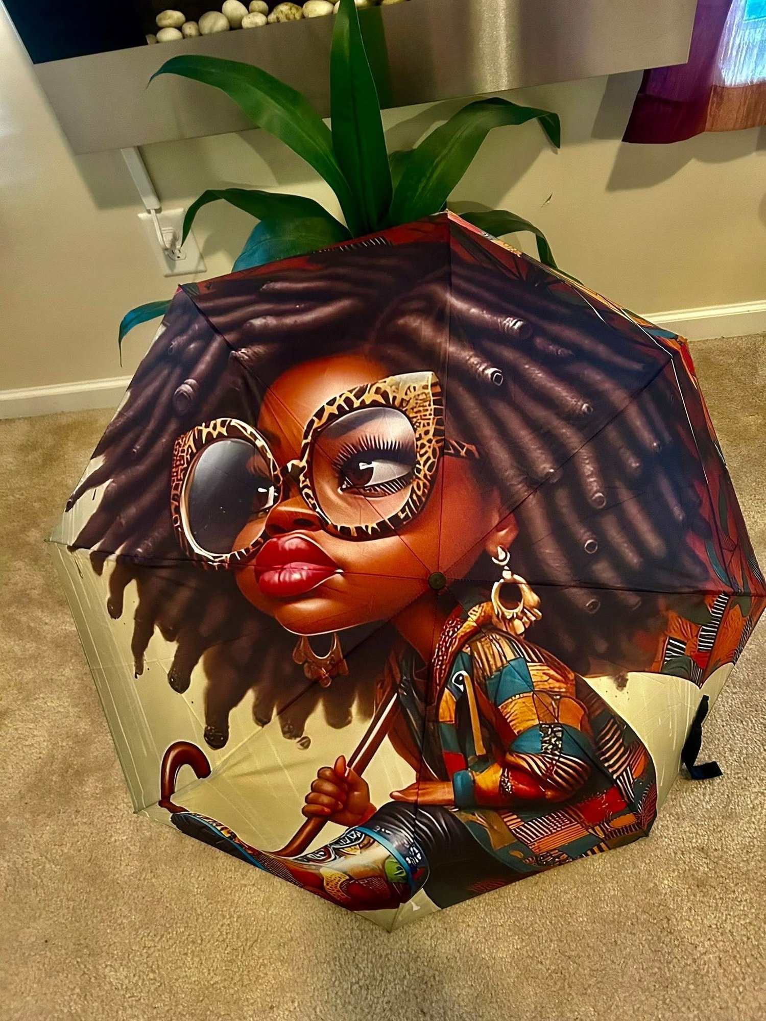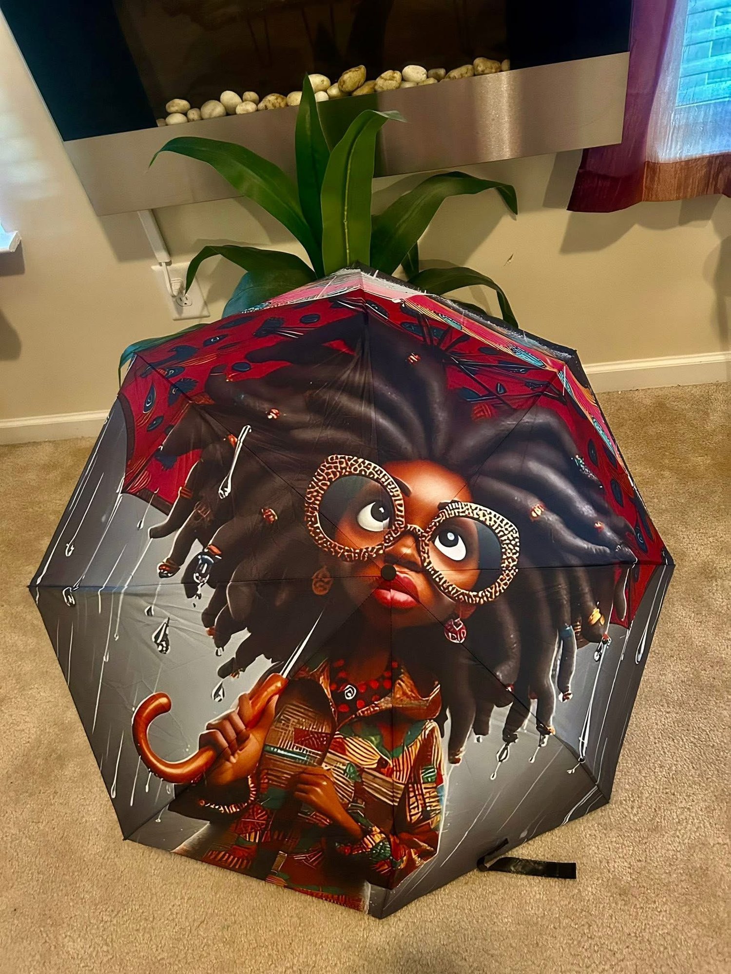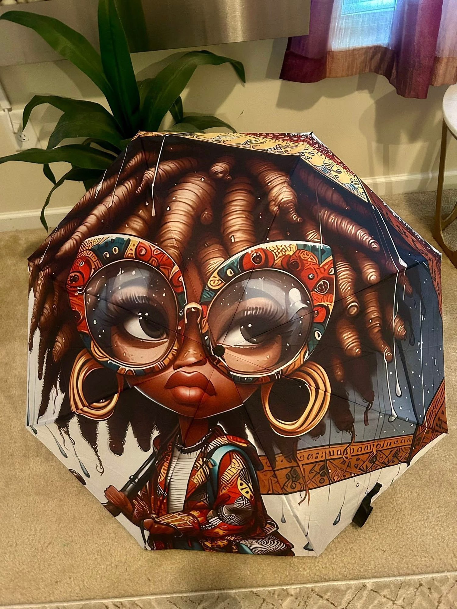 Each umbrella showcases stunning artwork of a confident, melanated woman rocking oversized locs, statement glasses, and vibrant African-inspired fashion. These pieces are more than umbrellas — they’re walking art and everyday confidence.