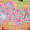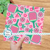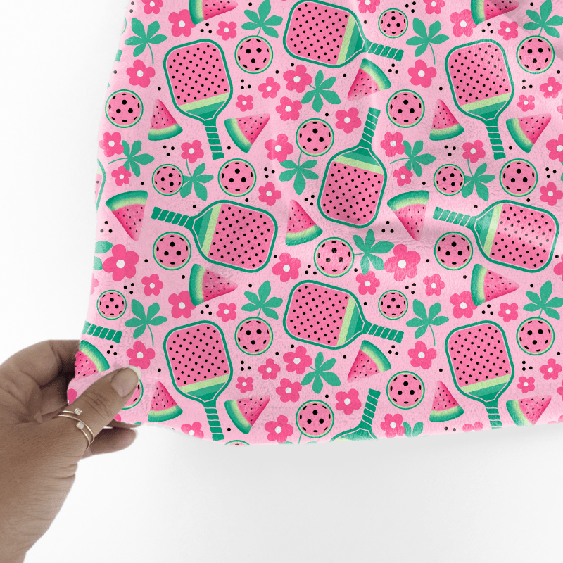 Pickleball paddles and balls with a pink watermelon theme.