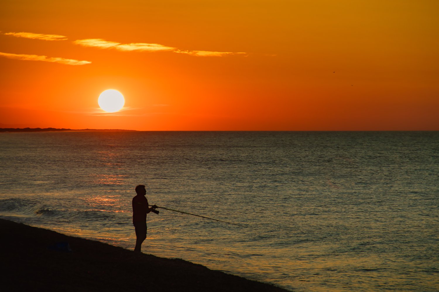 A lone figure fishing quietly at the water’s edge, line cast into the calm surface.