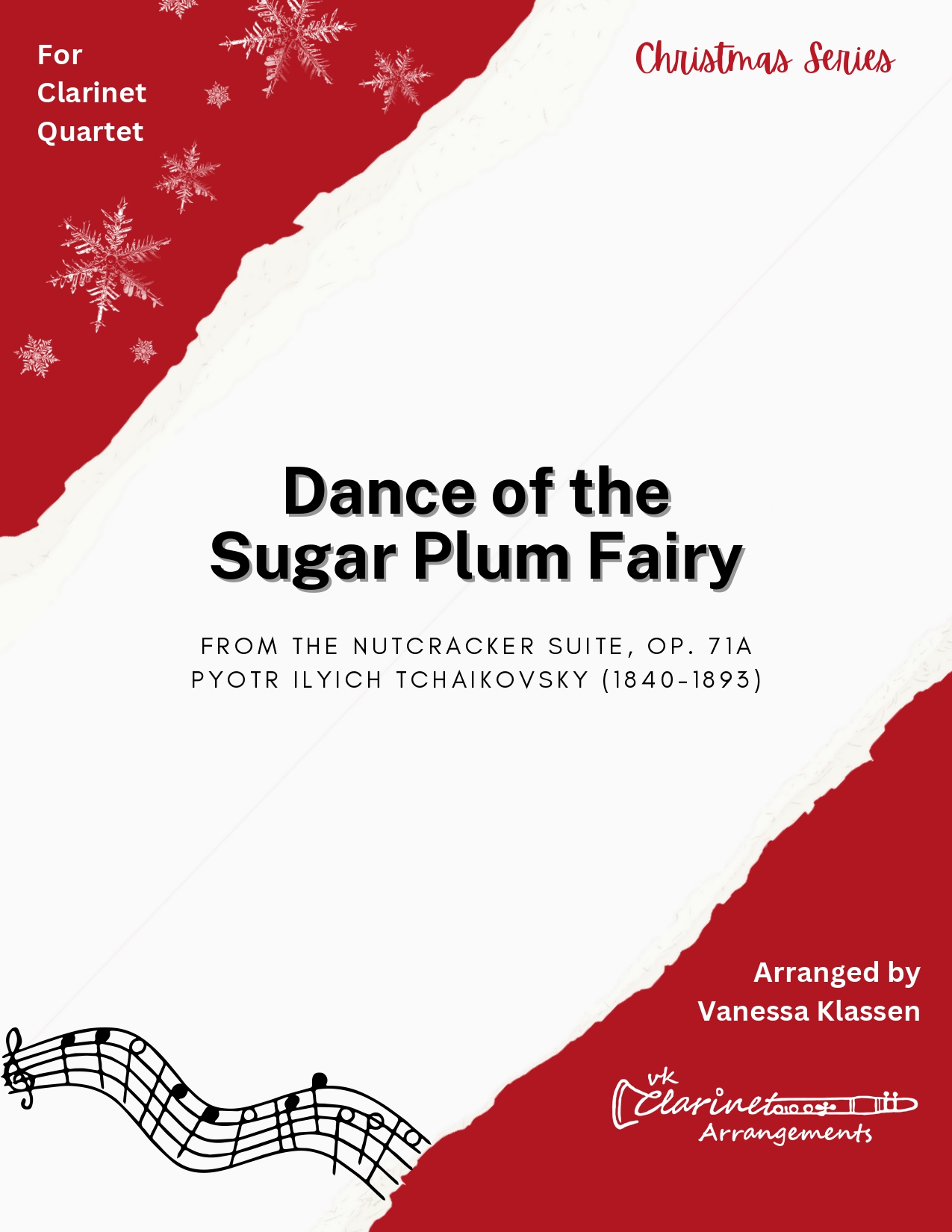 "Dance of the Sugar Plum Fairy" is the third movement of the second act of "The Nutcracker" ballet. The ballet choreographer, Marius Petipa wanted the music to sound like water dripping from a fountain. Tchaikovsky achieved this by featuring a brand-new instrument at the time that looked like a piano but sounded like bells-the celesta. This arrangement is for clarinet quartet, with the celesta part distributed between the parts.