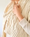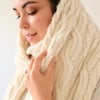 This knit offers a modern twist (ha!) on the classic arans. Inspired by asperitas clouds that create mesmerizing undulating patterns in the sky, the design features an array of different cables combined in an asymmetric composition. The cabled edges and the wide ribbing at the ends that flows seamlessly into the pattern polish it off.