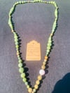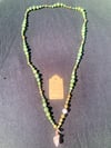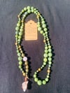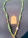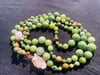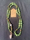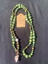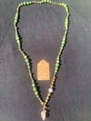 This mala is mostly green Jade but also has sandalwood and 1 turquoise stone. Also a small subtle arctic quartz.