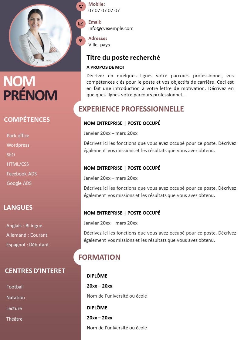 Que vous postuliez dans votre pays ou à l'international, il est essentiel d’avoir un CV impeccable qui capte l’attention des recruteurs. Nos modèles de CV sont spécialement conçus pour être à la fois modernes et professionnels, tout en restant 100% personnalisables. Ils sont disponibles en format Word et PowerPoint, ce qui vous permet de les modifier facilement, même sans compétences avancées en informatique.