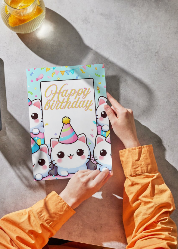 Make their special day extra purr-fect with this adorable 'Happy Birthday' printable cat card! Featuring charming kawaii kitties in party hats, vibrant confetti, and a clear 'Happy Birthday' message, this card is designed to bring instant joy to any cat lover's celebration. Simply download and print at home for a heartfelt, personalized birthday greeting ready in minutes.