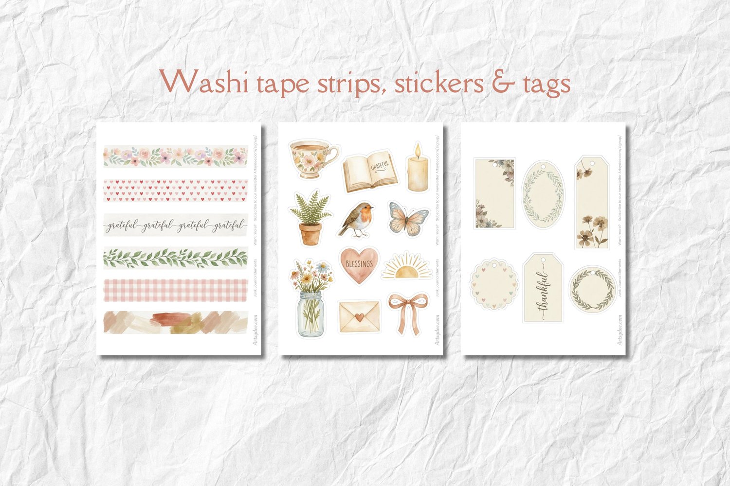 - Sticker sheets (gratitude words, botanicals, cozy icons)